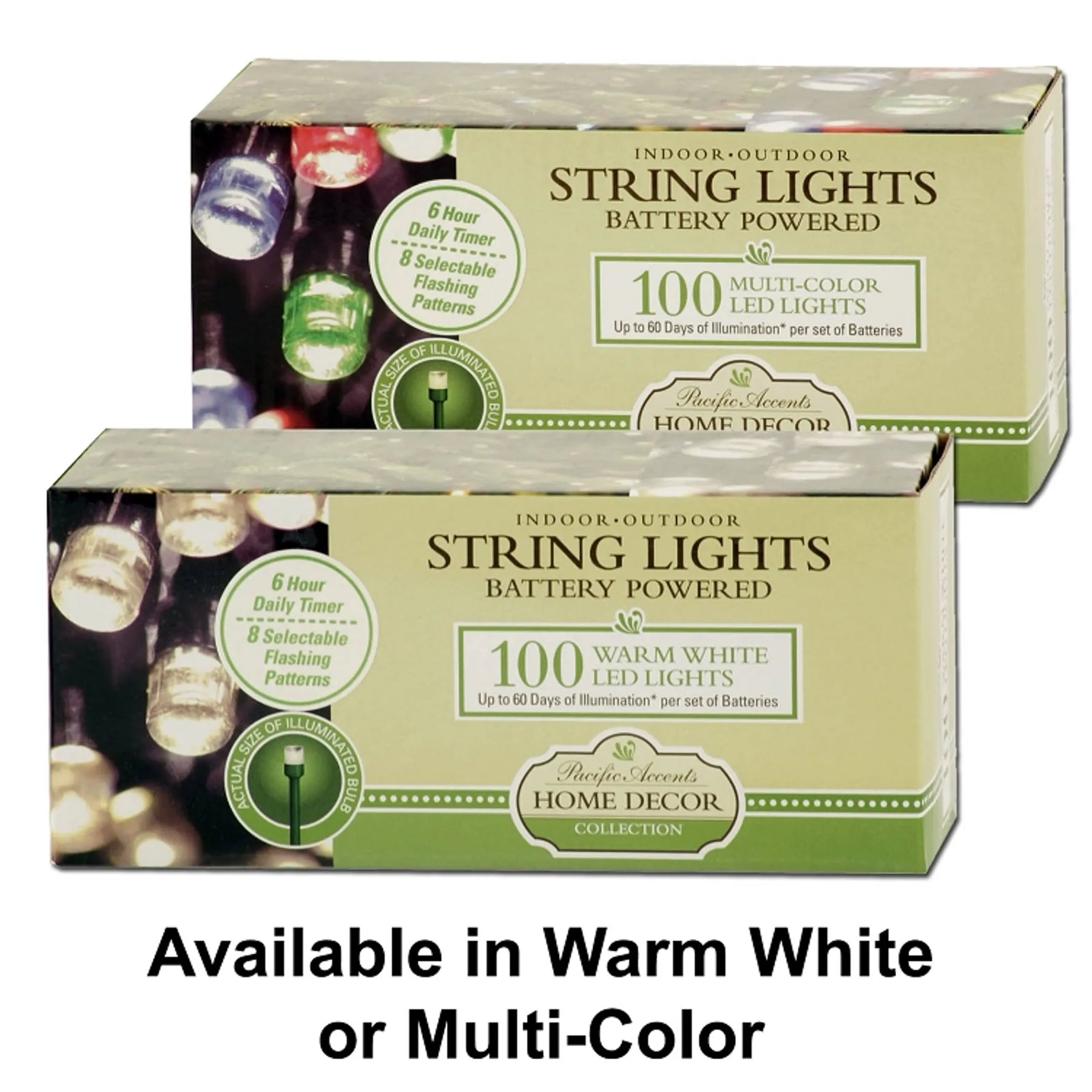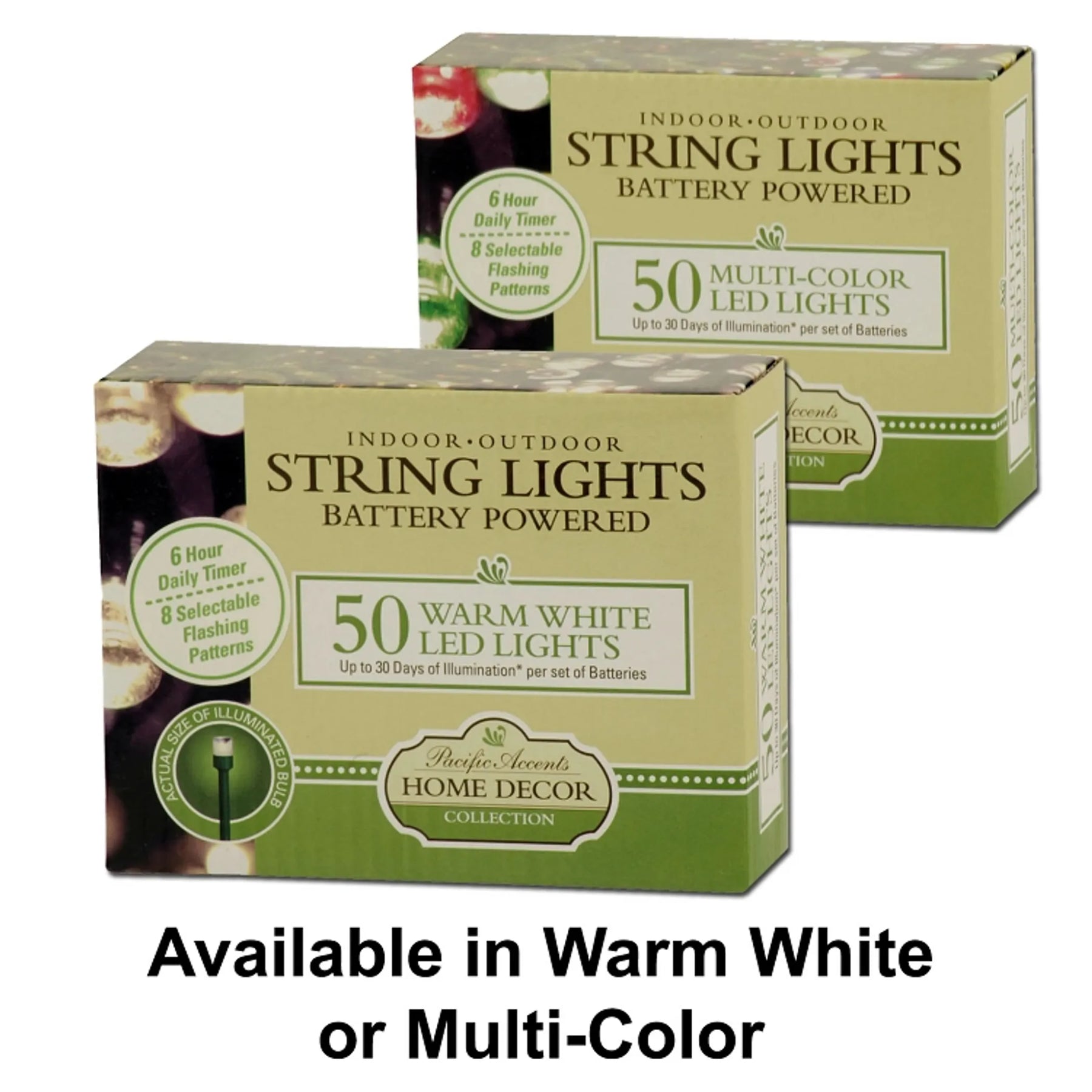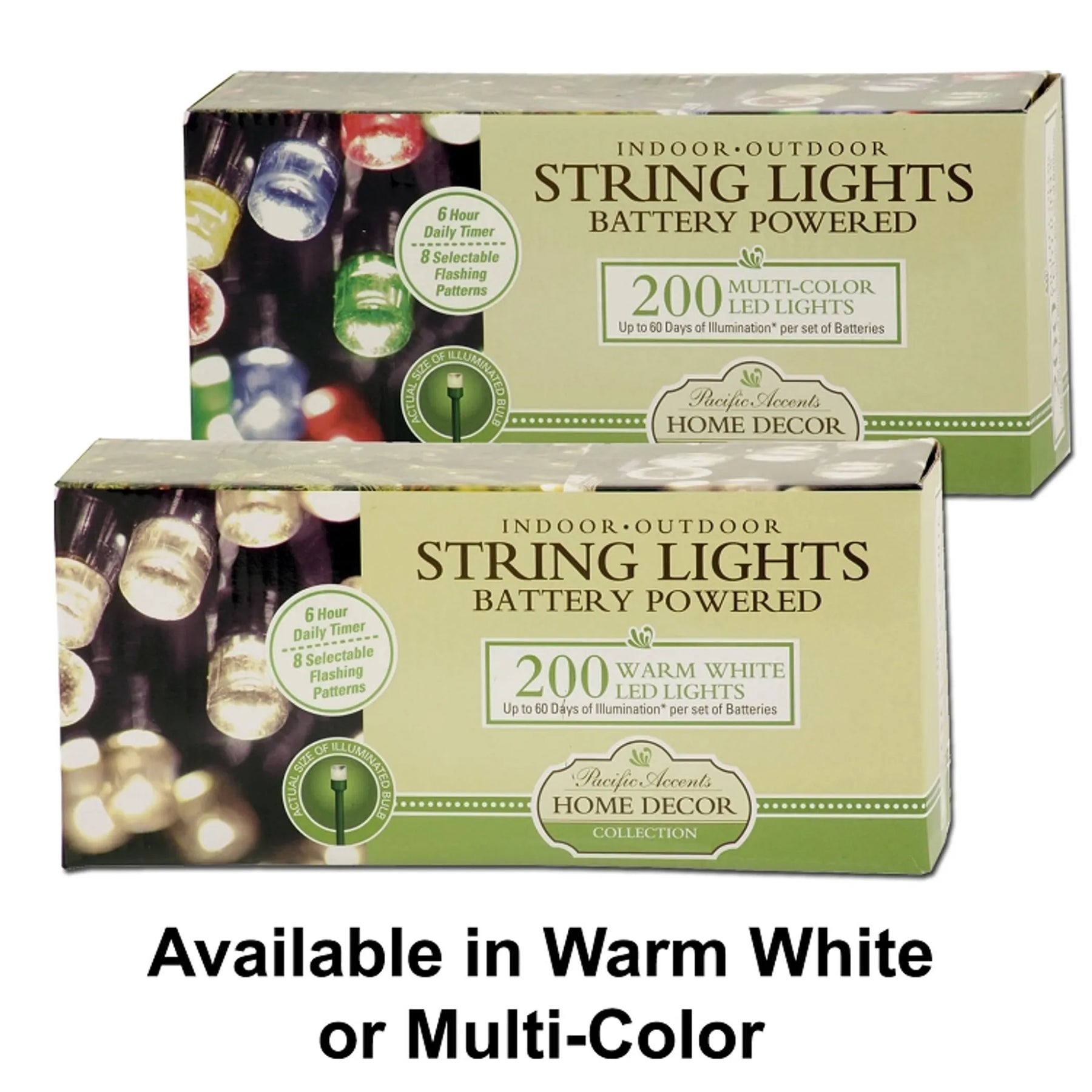 Battery operated LED string lights are the ideal solution for all of your holiday and party decorating ideas. Our string lights are suitable for indoor or outdoor use as they are weather and water resistant. Now you have the freedom to decorate in trees, kids rooms, around doors and even on your roof because there are no electrical cords to deal with. Each set of battery powered string lights features a 6 hour daily timer. Choose from steady on plus 7 selectable blinking modes.