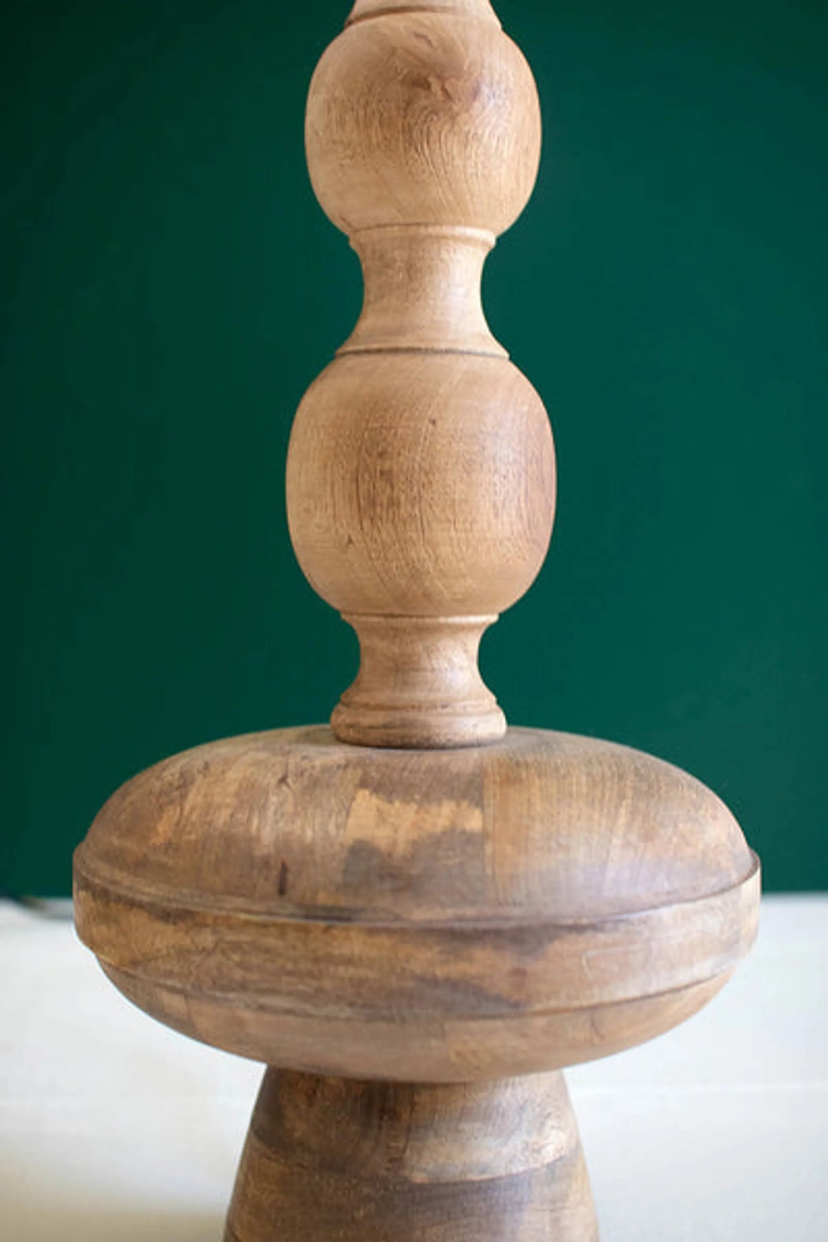 This beautifully carved table lamp has a layered look. The natural wood and barrel shade in white make this table lamp shine in any space. Made in India, this lamp brings light and style to any room.