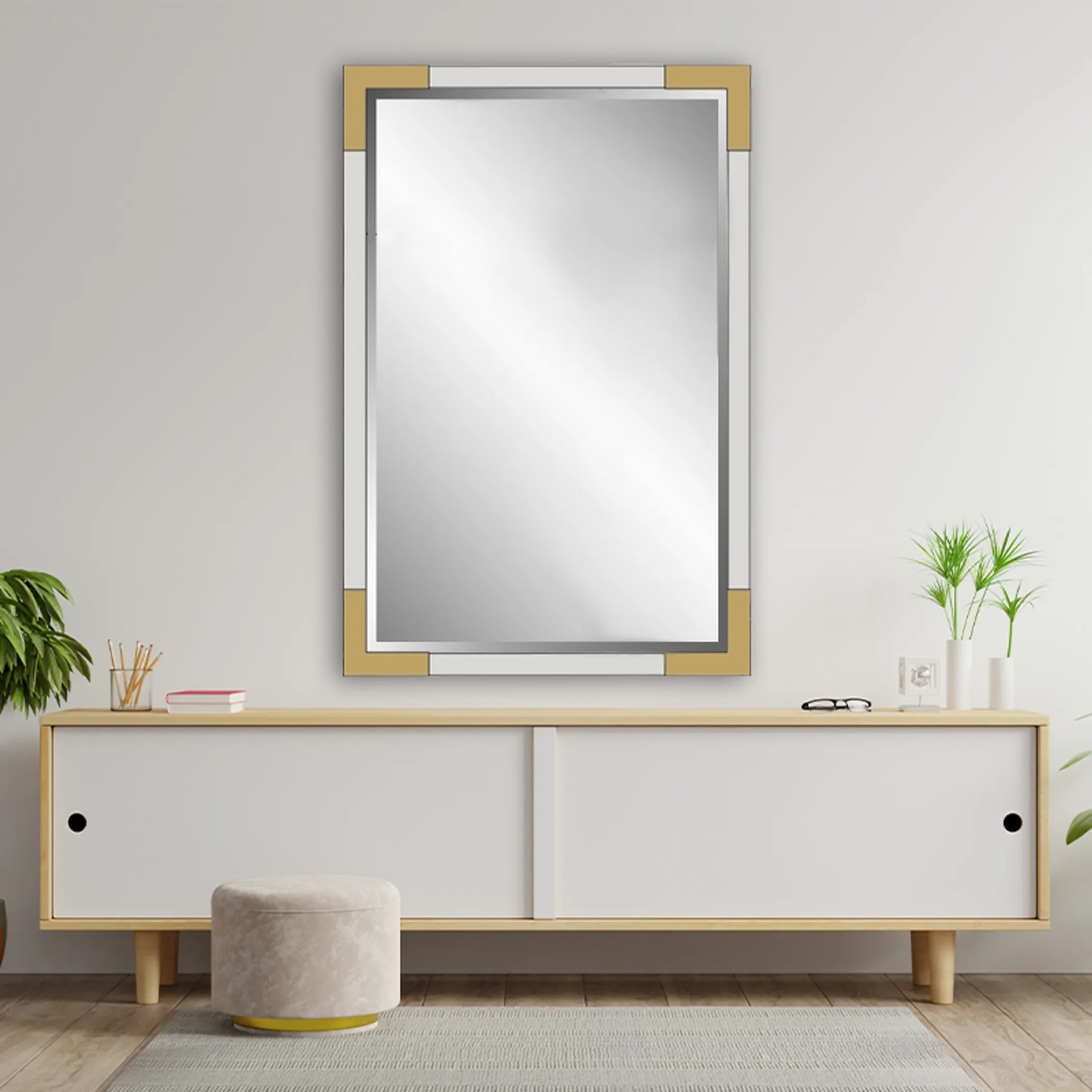 Large Iron Framed Vanity Wall Mirror ; Modern Contemporary, 5mm MDF Backboard, Decorative Functional Wall Mirror with Two-Tone Frame Detailing | 1" Beveled Glass | Champagne Silver Finish with Gold Finish Corners | Overall Dimensions 28" x 42" x 2"; by SBC D?cor
