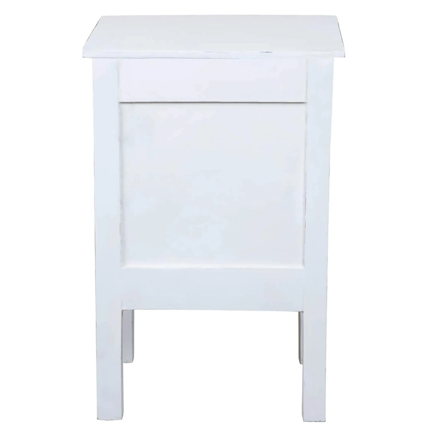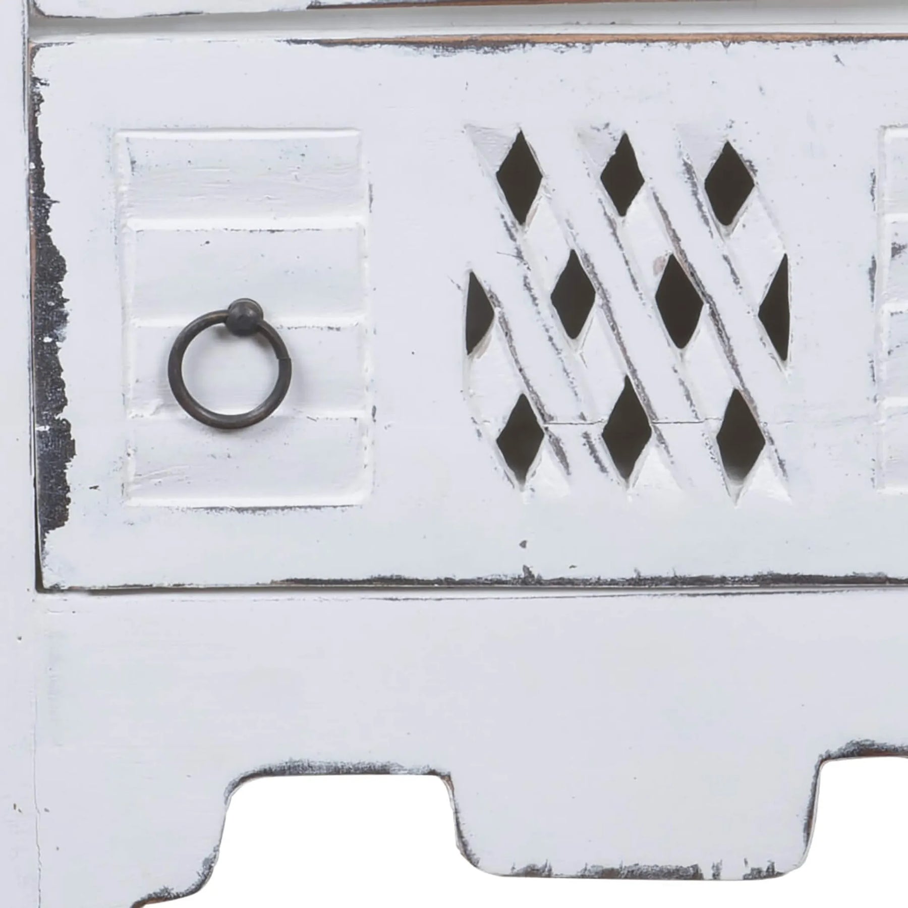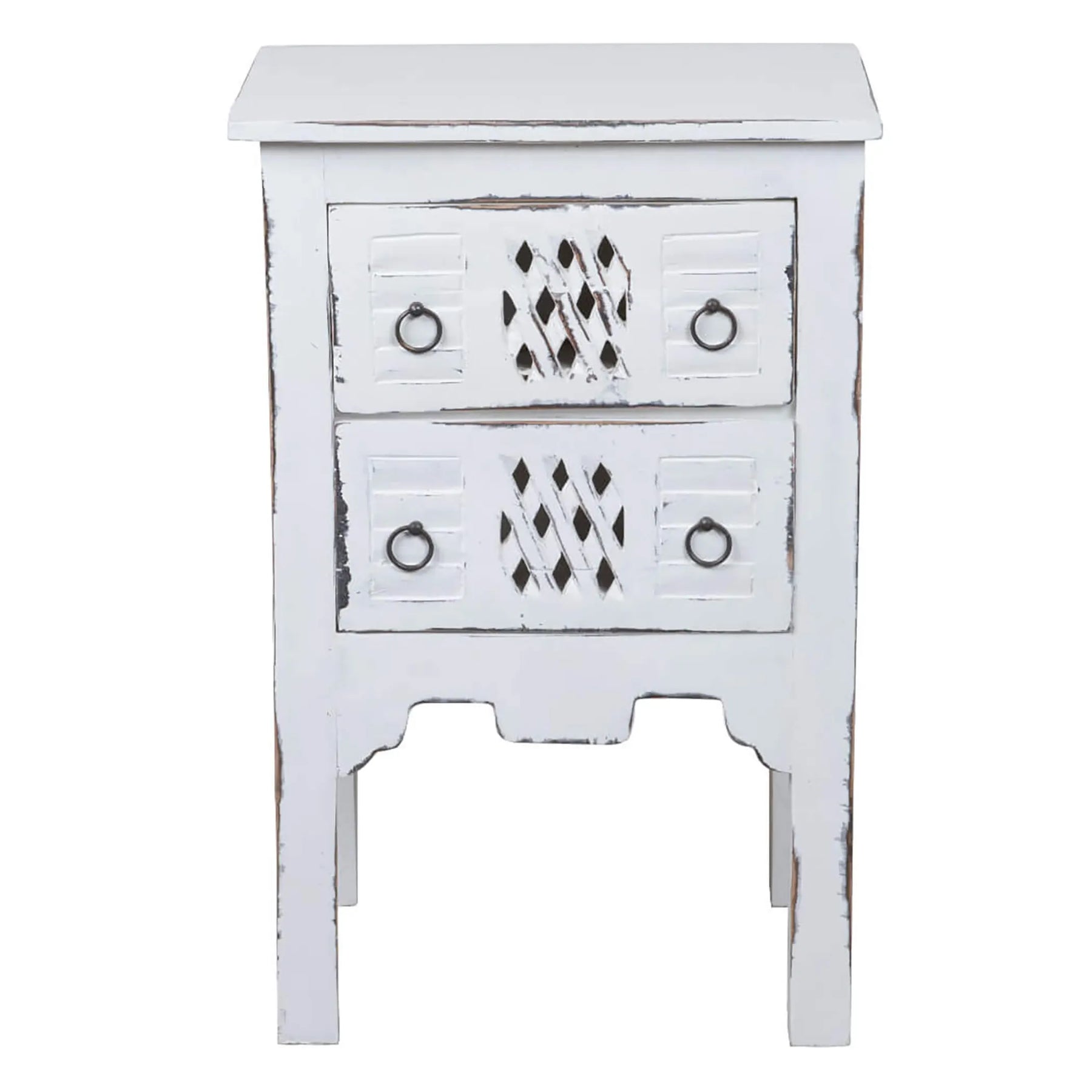 Add shabby chic charm with this whitewashed solid Mahogany wood side table. Use as nightstand, living room side table or entryway accent. Open slats on sides provide Mission style with louvered and lattice front for a beachy vibe. The combination of textures and curves create an interesting storage table that will brighten any room.