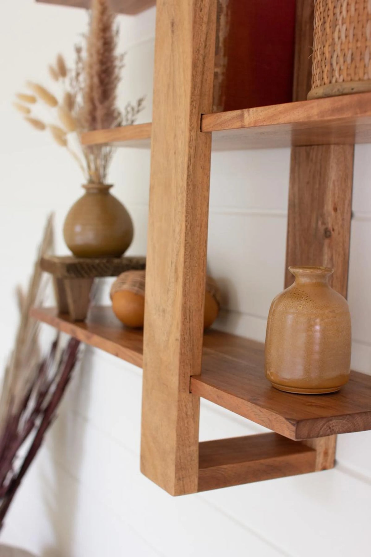 Take care of business with this adjustable wall shelf for displaying your wares or favorite finds. Made of acacia wood, these three tiers adjust to make a shelf of your choosing. Use for home or business.