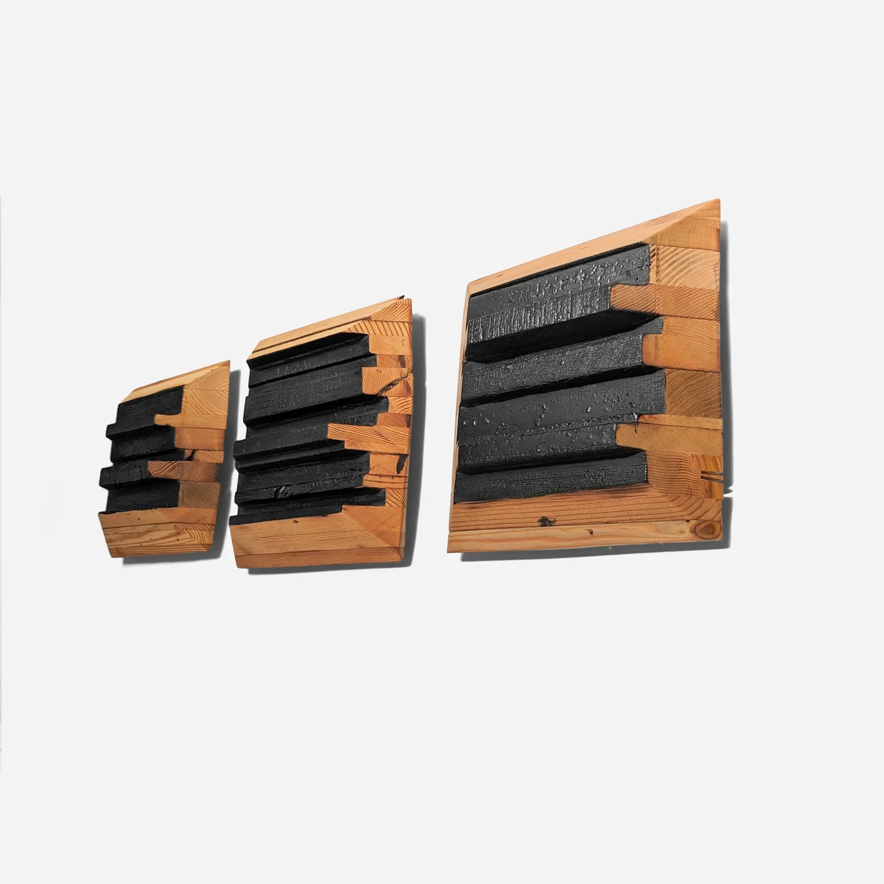 • In this tryptic the wood is fabricated, and then center area is charred, epoxy hardened and painted. The outside "frame" is oiled.