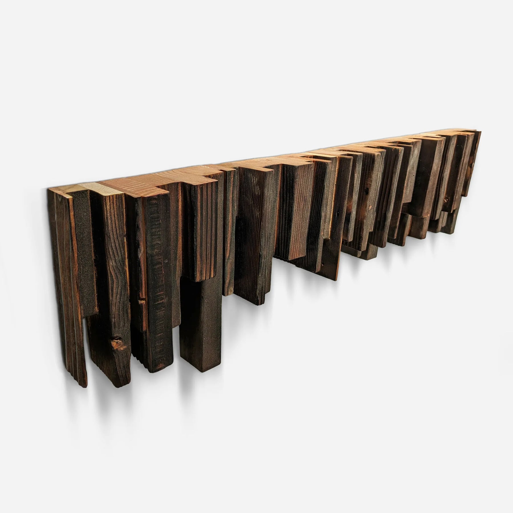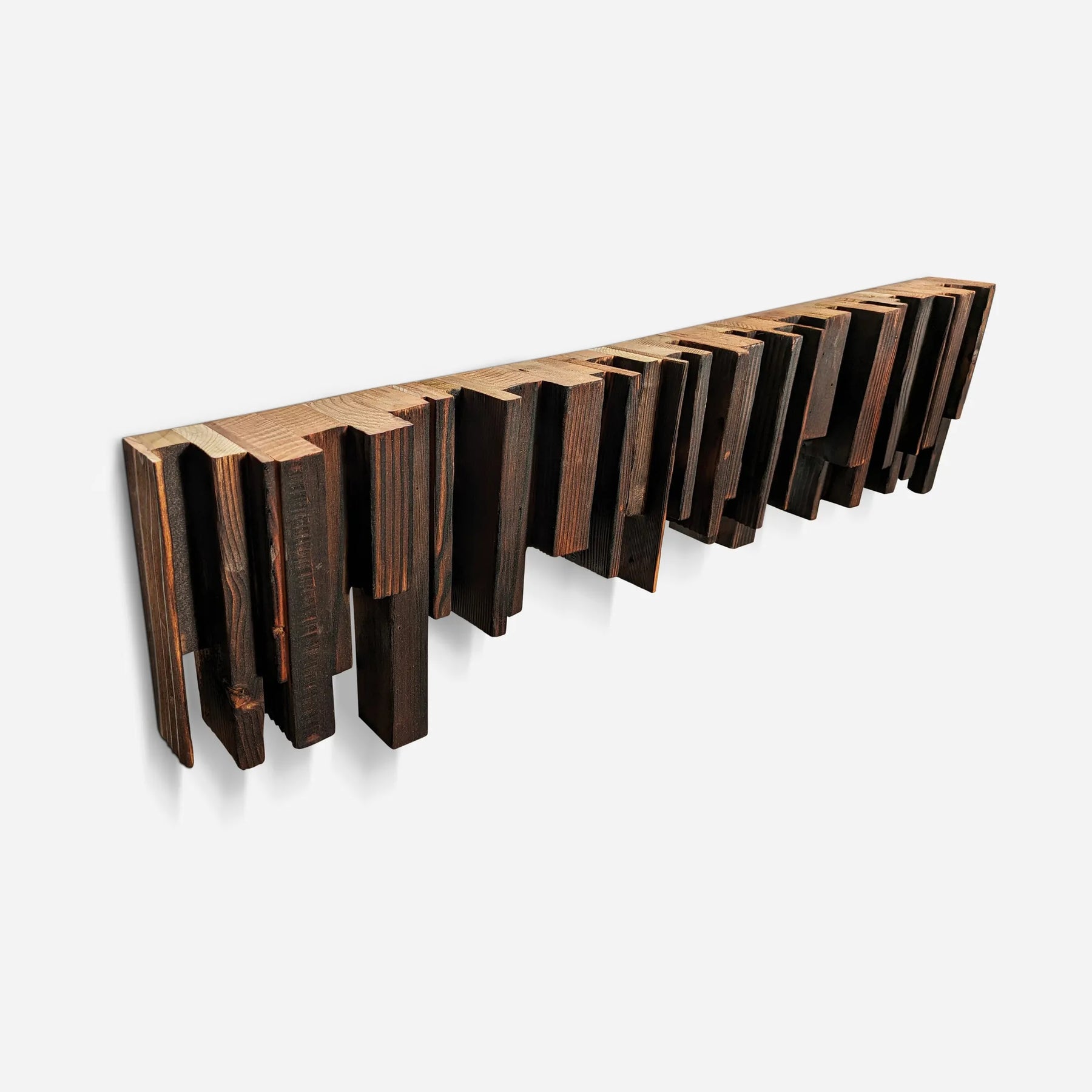 • The random sized pieces of wood are cut out and glued in an "organized chaos" pattern to create a straight horizontal surface that exposes the beautiful end grain. The sides are charred, brushed and oiled.