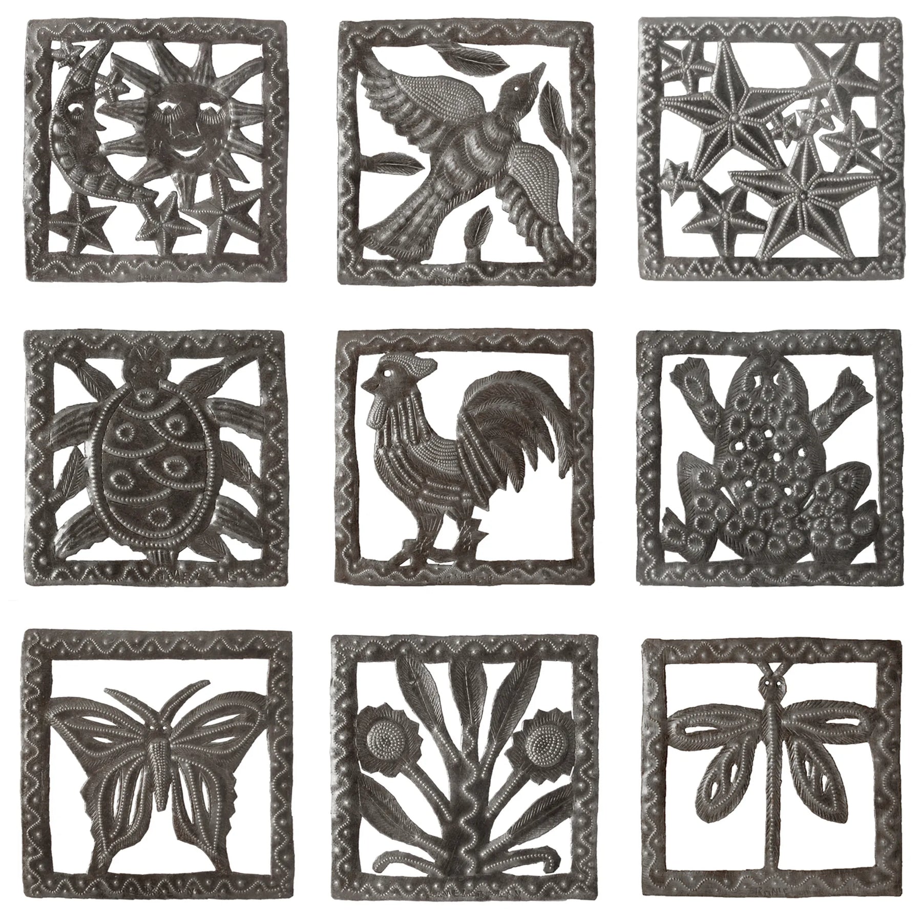 Perfect for home or garden, each Assorted Squares - Set of 9 is approximately 6" x 6" x 0.5" and hand-chiseled out of recycled steel oil drums by Haitian artisans using techniques first developed by Georges Liautaud in the late 1950s when he chalked out his first design on a flattened steel oil drum and then cut it out by hand with a mallet and chisel. As each piece is handmade, their final dimensions and finish may vary slightly.