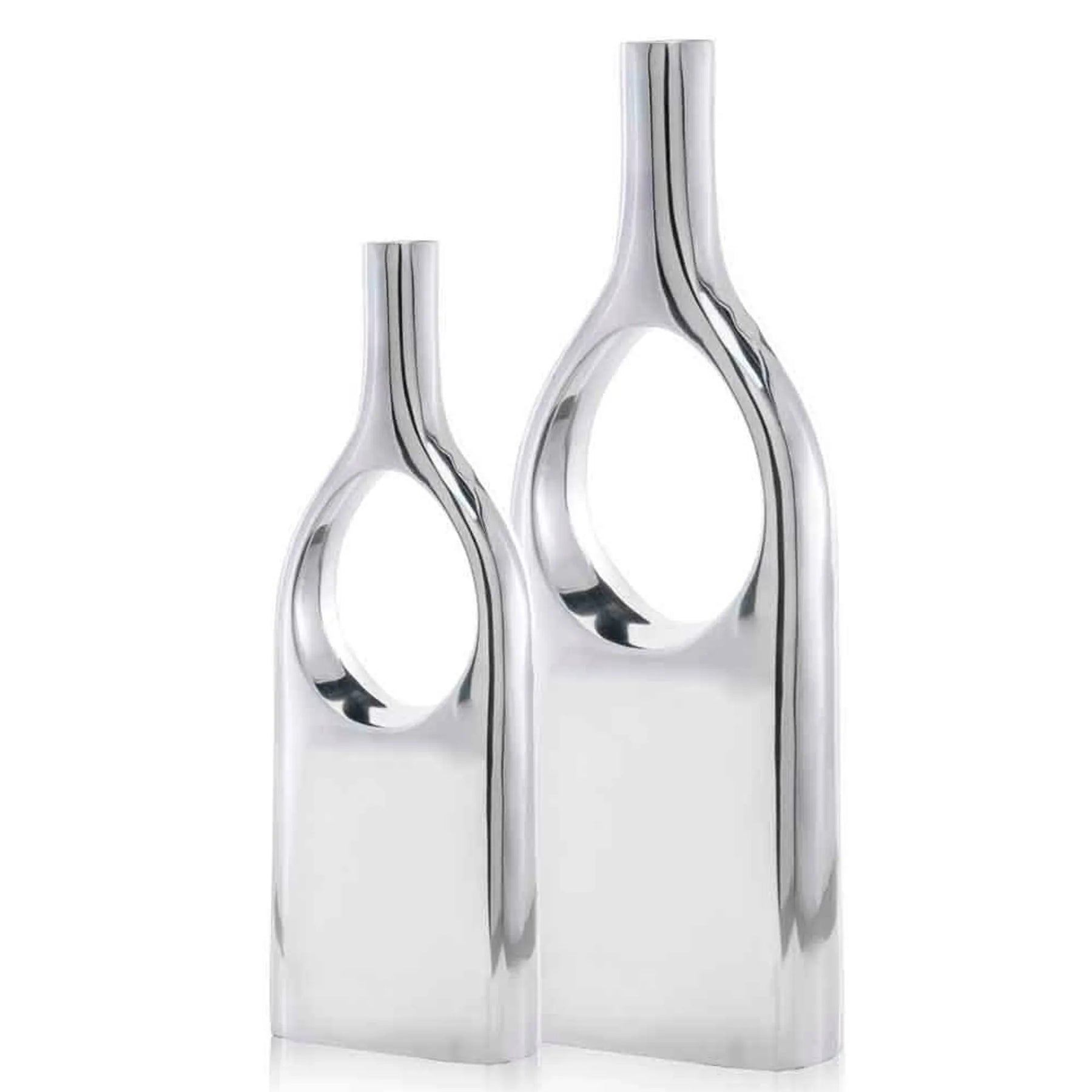 The Vista View Through Vases are Classic and Contemporary. Sold in a Set of 2 the are made of Heavy Cast Aluminum with wide open view through spaces. Finished in a Buffed Shiny Silver Exterior these Vases make a Statement in Contemporary Decor's. **CLEARANCE - LIST PRICE $159.50
