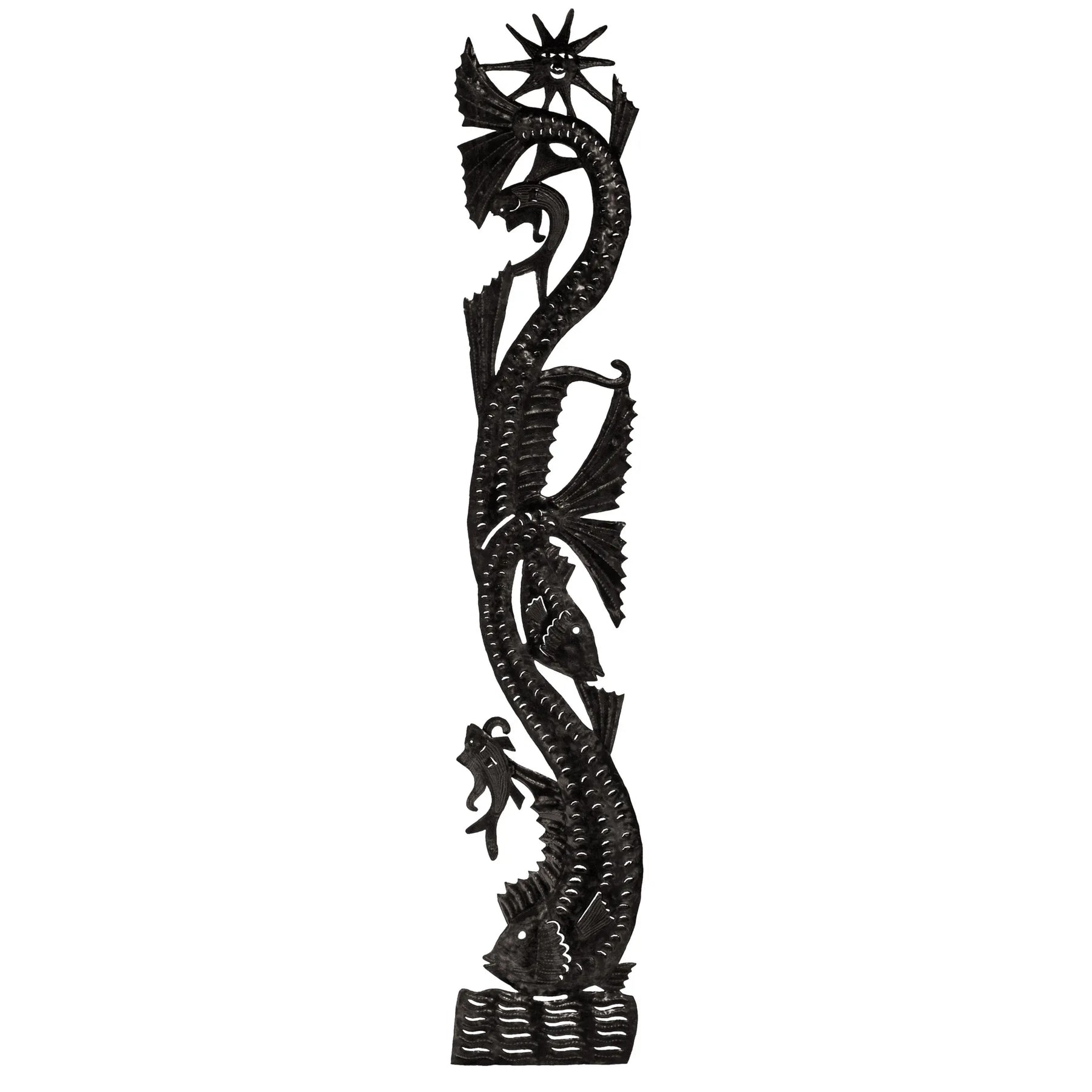 Perfect for home or garden, each Fish #3 is approximately 12" x 72" x 0.5" and hand-chiseled out of recycled steel oil drums by Haitian artisans using techniques first developed by Georges Liautaud in the late 1950s when he chalked out his first design on a flattened steel oil drum and then cut it out by hand with a mallet and chisel. As each piece is handmade, their final dimensions and finish may vary slightly.