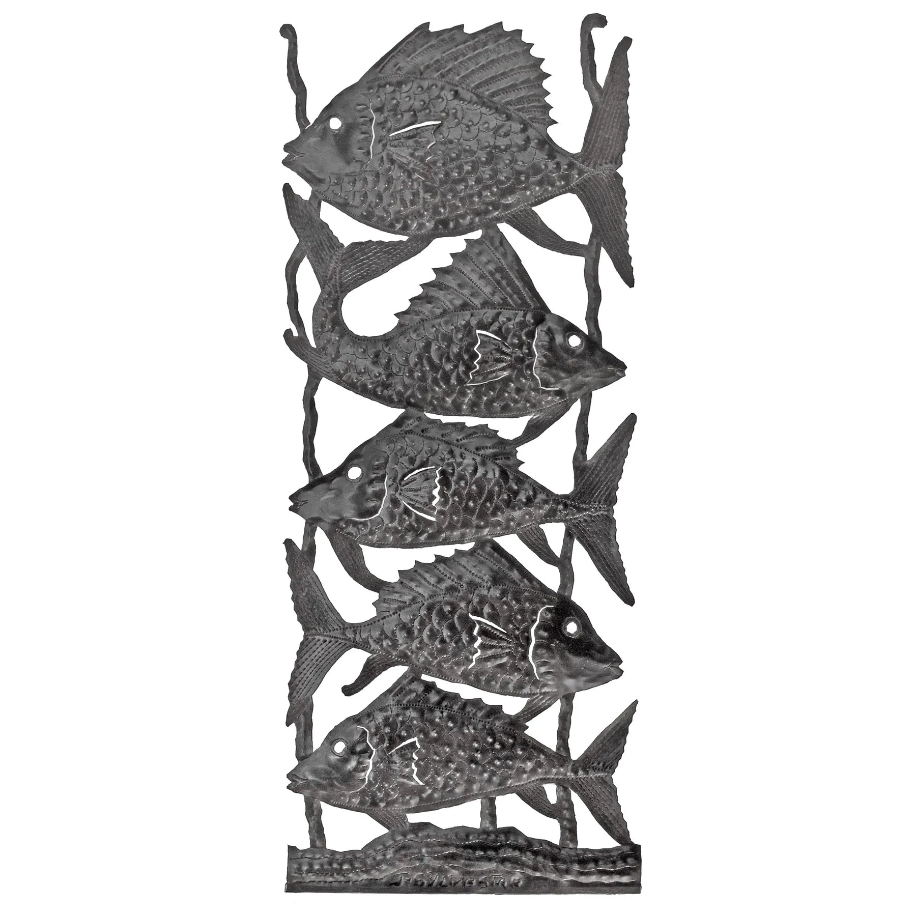 Perfect for home or garden, each Five Fish is approximately 14" x 34" x 0.5" and hand-chiseled out of recycled steel oil drums by Haitian artisans using techniques first developed by Georges Liautaud in the late 1950s when he chalked out his first design on a flattened steel oil drum and then cut it out by hand with a mallet and chisel. As each piece is handmade, their final dimensions and finish may vary slightly.