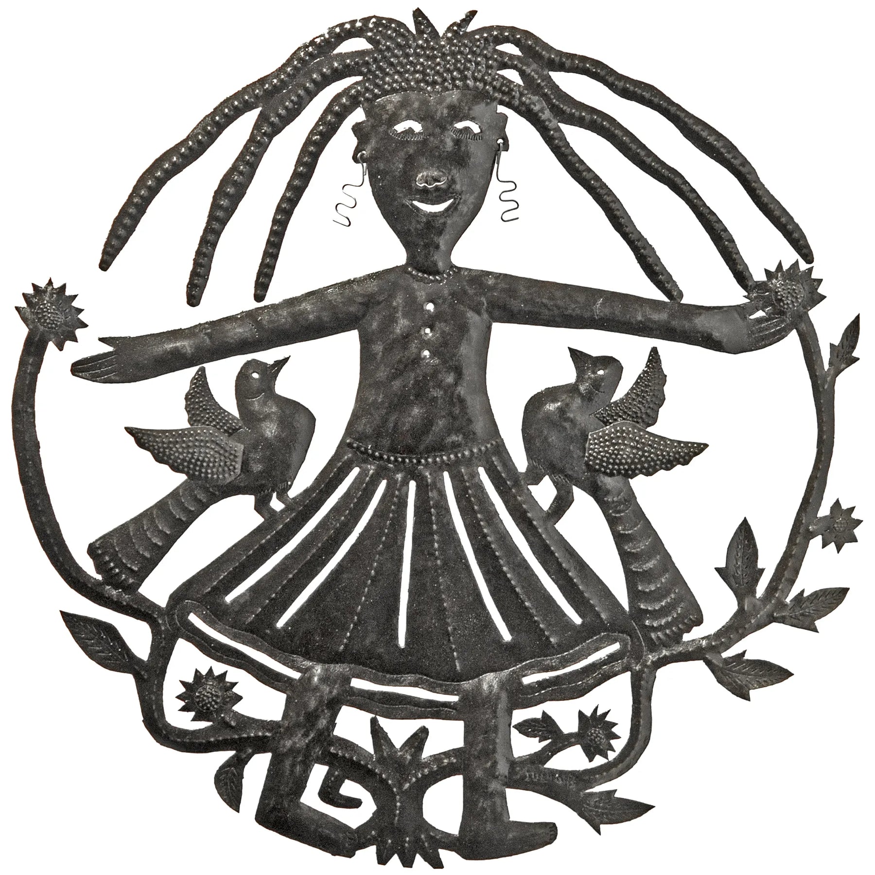 Perfect for home or garden, each Girl with Two 3D Birds is approximately 23" x 23" x 0.5" and hand-chiseled out of recycled steel oil drums by Haitian artisans using techniques first developed by Georges Liautaud in the late 1950s when he chalked out his first design on a flattened steel oil drum and then cut it out by hand with a mallet and chisel. As each piece is handmade, their final dimensions and finish may vary slightly.
