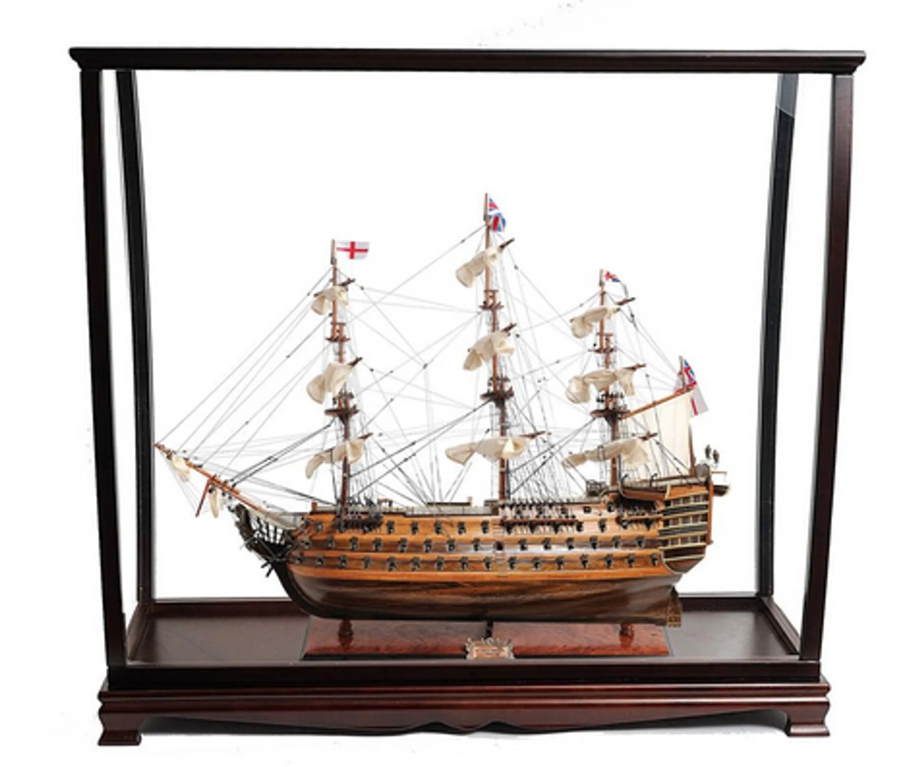 Are you looking for a perfect display combination? Our HMS Victory 30" model and display case combo will sure to set your home or office apart! The Model: H.M.S. Victory, Adm. Horatio Nelson’s flagship at the Battle of Trafalgar in 1805, is now available as a museum-quality, FULLY ASSEMBLED model. This is an “Exclusive Edition" where the model has a unique serial number etched into the hull, which allows us to identify production date, the material used and all other production information of a model. Master craftsmen using historical photographs, drawings or original plans meticulously handcraft these highly detailed wood models from scratch. They are built to scale with high-grade wood such as western red cedar, rosewood, and mahogany. They are 100% hand built individually using plank-on-frame construction method and are similar to the building of actual ships. Each model requires hundreds of hours to finish and must go through a demanding quality control process before leaving the workshop. This amazing replica of the H.M.S. Victory model features plank on frame, three decks, and three ferocious rows of metal cannons on each side of the ship. The front bowsprit and three large masts are connected securely using advanced rigging and lines painstakingly knotted and fastened by hand. Each yard has an attached hand-stitched rolled-up sail made of fine linen. Metal anchors and a wooden rudder are visible on the front and rear of the ship. On the deck, there are authentic hand-built lifeboats with ribs and planks, stationed metal cannons, metal steering wheels, wooden crane, captain’s dining and sleeping cabin, and many other handcrafted ornaments. There is also an exquisite detailed admiral’s quarter on the stern with beautiful metal lanterns, handcrafted brass statues and ornaments, and a wooden flagpole. This model comes standard with a solid wood base and brass nameplate. It’ll make a perfect gift for home or office decorator, boat enthusiast, or passionate collector. This beautiful tabletop display case was made out of hardwood and painted in dark mahogany color. It has distinctive designs that add elegance and beauty when displayed in your home or office. It is 100% fully assembled and comes with plexiglass panels on all sides. It features the curves on the sides of the case which enable it to accommodate models with wide yards. This case is very effective when it comes to preventing dust particles as well as keeping your valuable tall ship looking new and protected at all time. It is a must-have for model ship enthusiasts or passionate collectors.