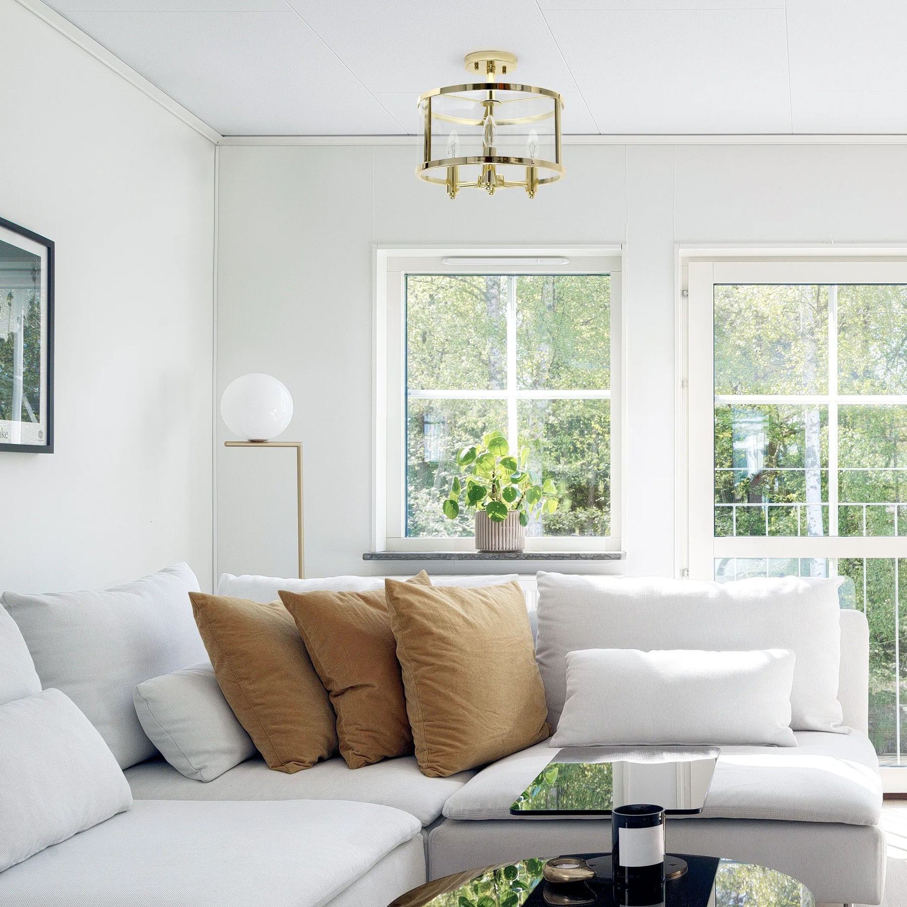 A mix of vintage and modern design brings you this beautiful, timeless semi-flushmount. The 3-light ceiling light is made of clear glass walls wrapped within an iron frame available in a variety of finishes to provide the ideal match for the space of your choice. This is the perfect piece to not only spruce up your decor, but the transparency of the fixture will surely illuminate your space in style.