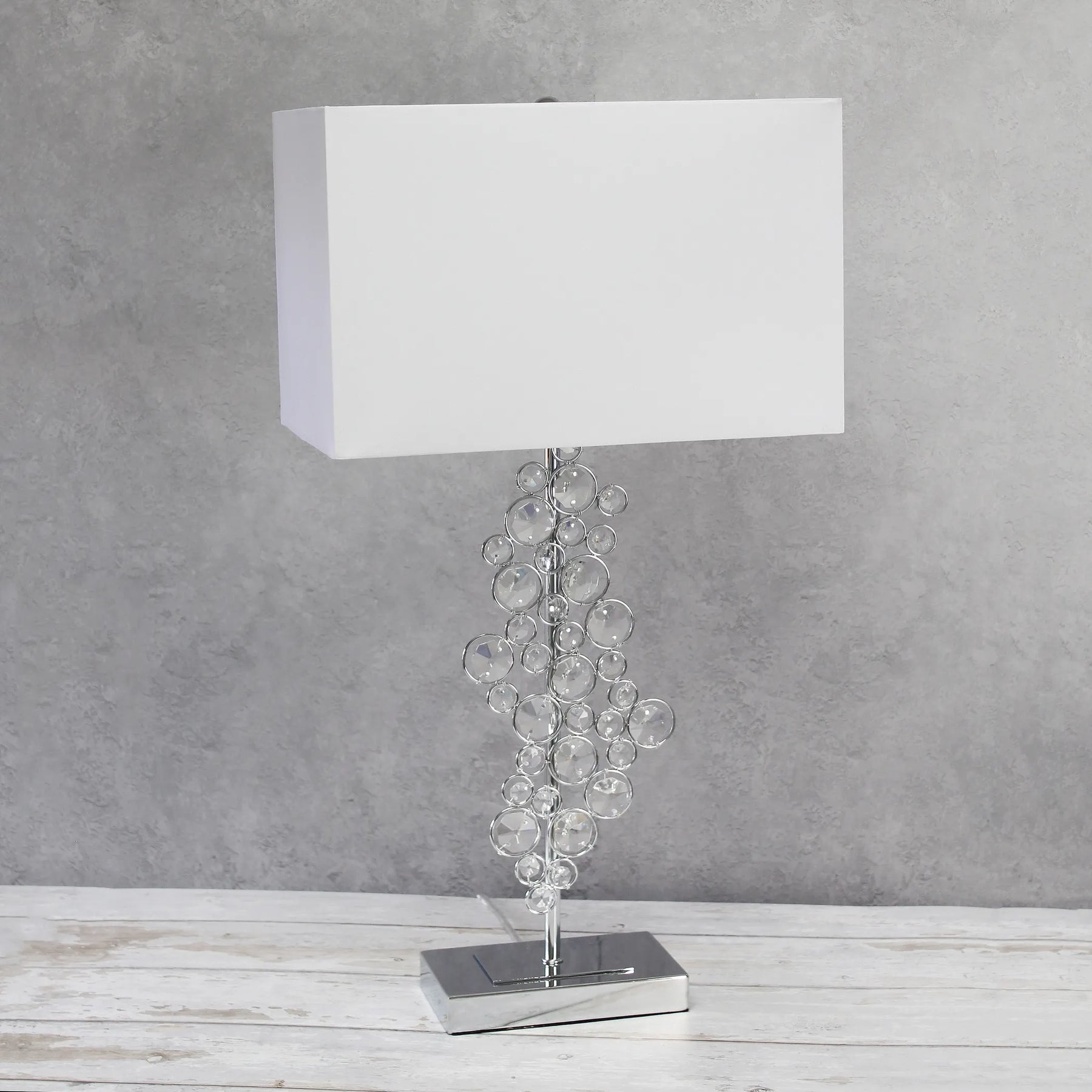 An embellished array of prismatic crystals sits among a chrome stemmed base and is paired with a rectangle shaped white fabric shade. Sitting at 26.25", this sophisticated, creative, and timeless lamp will not only brighten up your space but will satisfy your desire of a compelling piece of decor for the room of your choice.