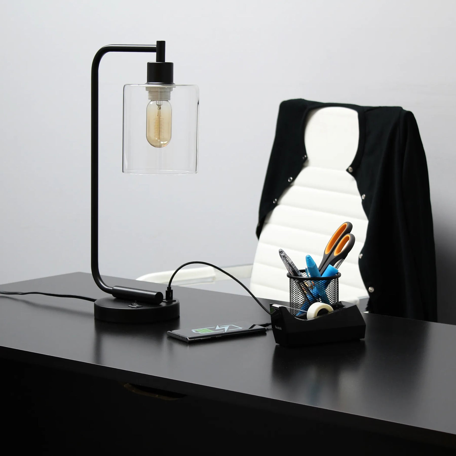 Simple yet modern, this desk lamp is sure to add a touch of style to any room in your home. This beautifully crafted iron desk lamp combines a simple base with a curved arm, (2) USB ports, and a clear cylinder glass shade for a sleek and sophisticated combination. Perfect for your desk, foyer or bedside table for a modest, refined look in trendy lighting. **HELPFUL TIP: To get the complete industrial look, we recommend using a decorative Edison/Vintage bulb (not included). **