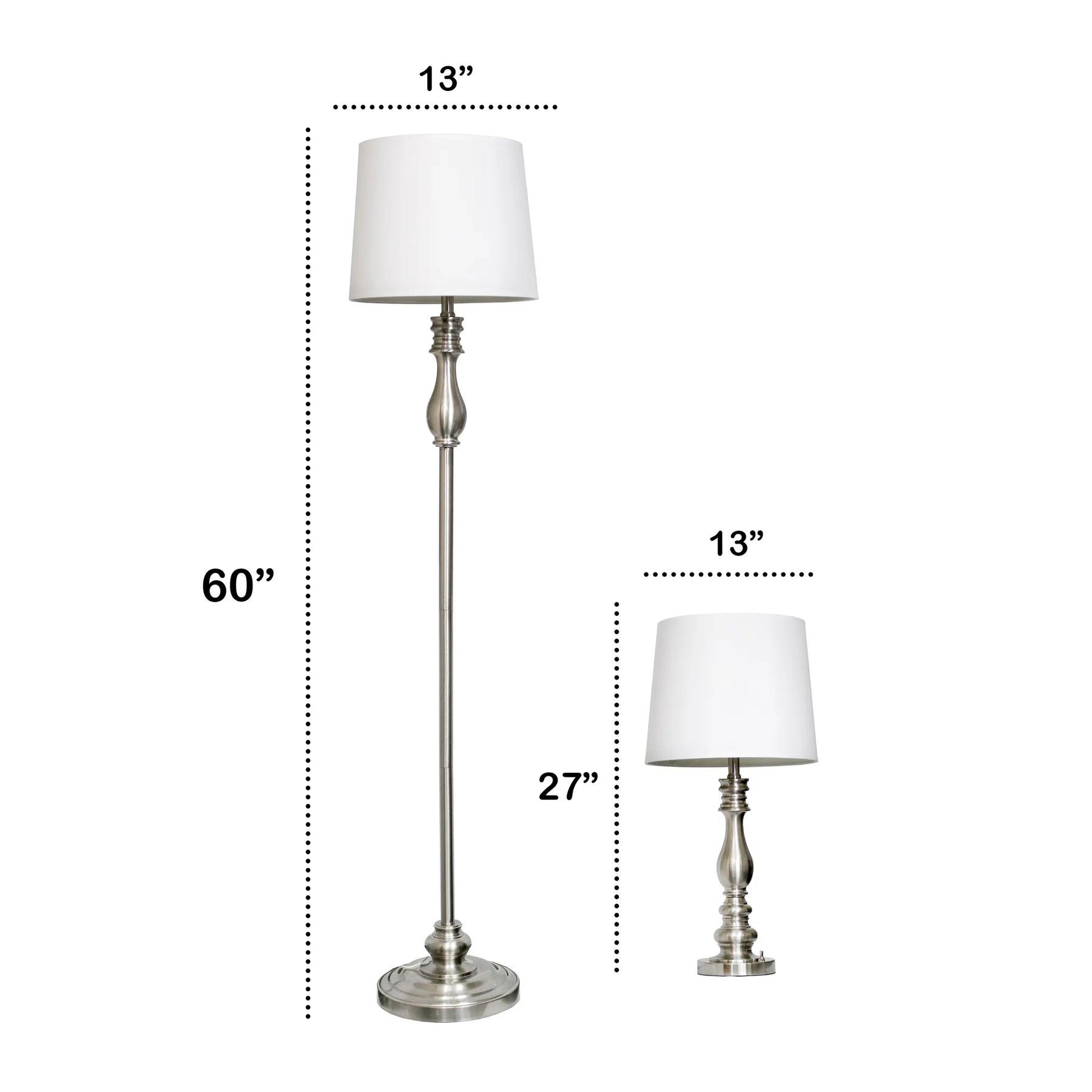 Upgrade your lighting decor with this beautiful 3 piece classic, yet contemporary matching table and floor lamp set! The brushed steel finish graciously embraces the curvy shaped base of each lamp, and is paired with a lovely white fabric shade to bring you a sophisticated decor style while satisfying your lighting needs. Perfect for modern, traditional, and contemporary spaces!