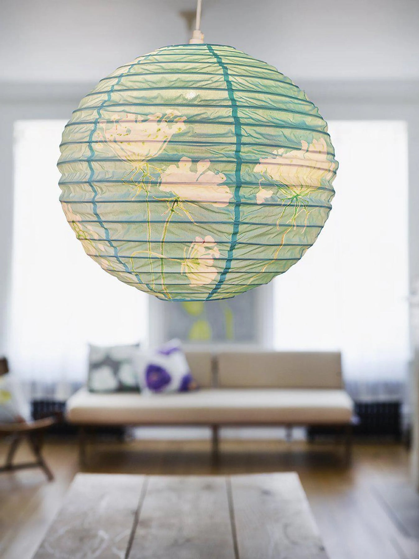 Hanging lantern with collapsible rattan frame, covered in printed cotton poplin. Lantern measures 15" in diameter. Beautiful when used as a hanging lampshade with bulb inside or on its own. Handmade in a fair trade workshop in Bali.