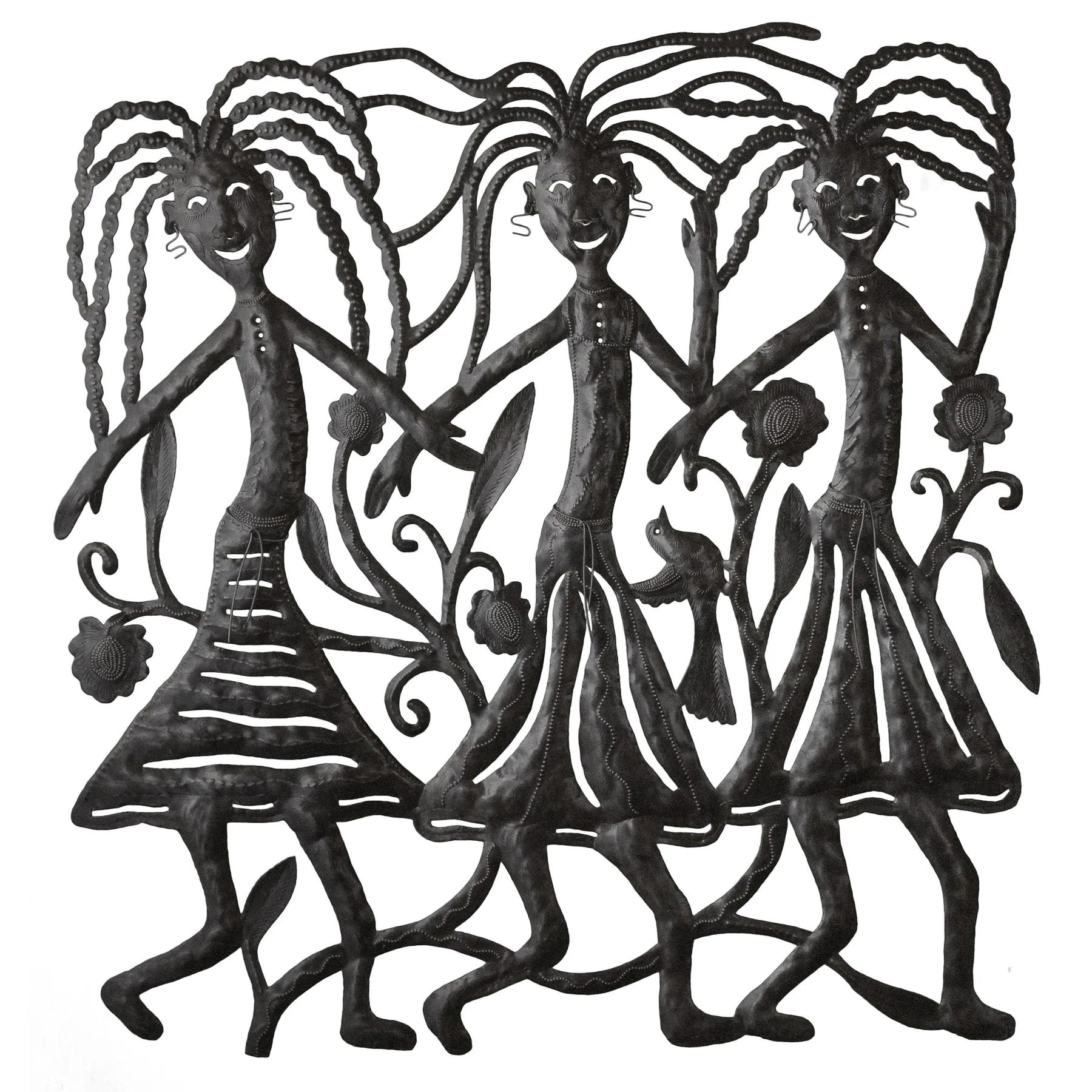 Perfect for home or garden, each Large Three Sisters is approximately 33" x 33" x 0.5" and hand-chiseled out of recycled steel oil drums by Haitian artisans using techniques first developed by Georges Liautaud in the late 1950s when he chalked out his first design on a flattened steel oil drum and then cut it out by hand with a mallet and chisel. As each piece is handmade, their final dimensions and finish may vary slightly.