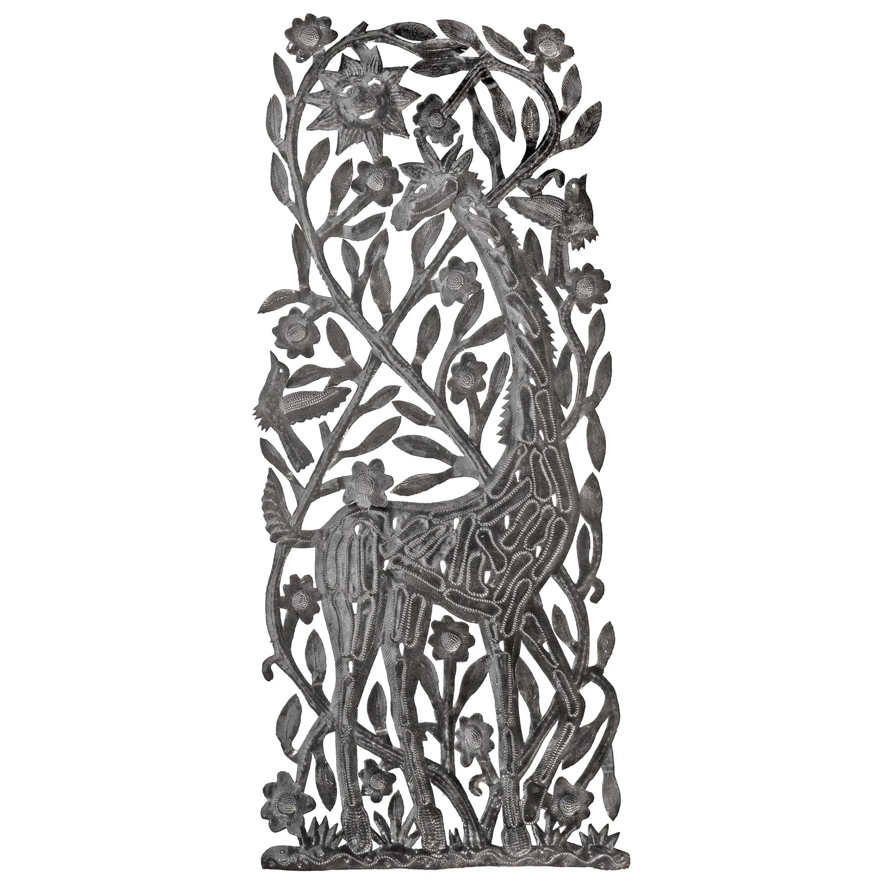 Perfect for home or garden, each Reticulated Giraffe Looking Through Canopy is approximately 14" x 34" x 0.5" and hand-chiseled out of recycled steel oil drums by Haitian artisans using techniques first developed by Georges Liautaud in the late 1950s when he chalked out his first design on a flattened steel oil drum and then cut it out by hand with a mallet and chisel. As each piece is handmade, their final dimensions and finish may vary slightly.
