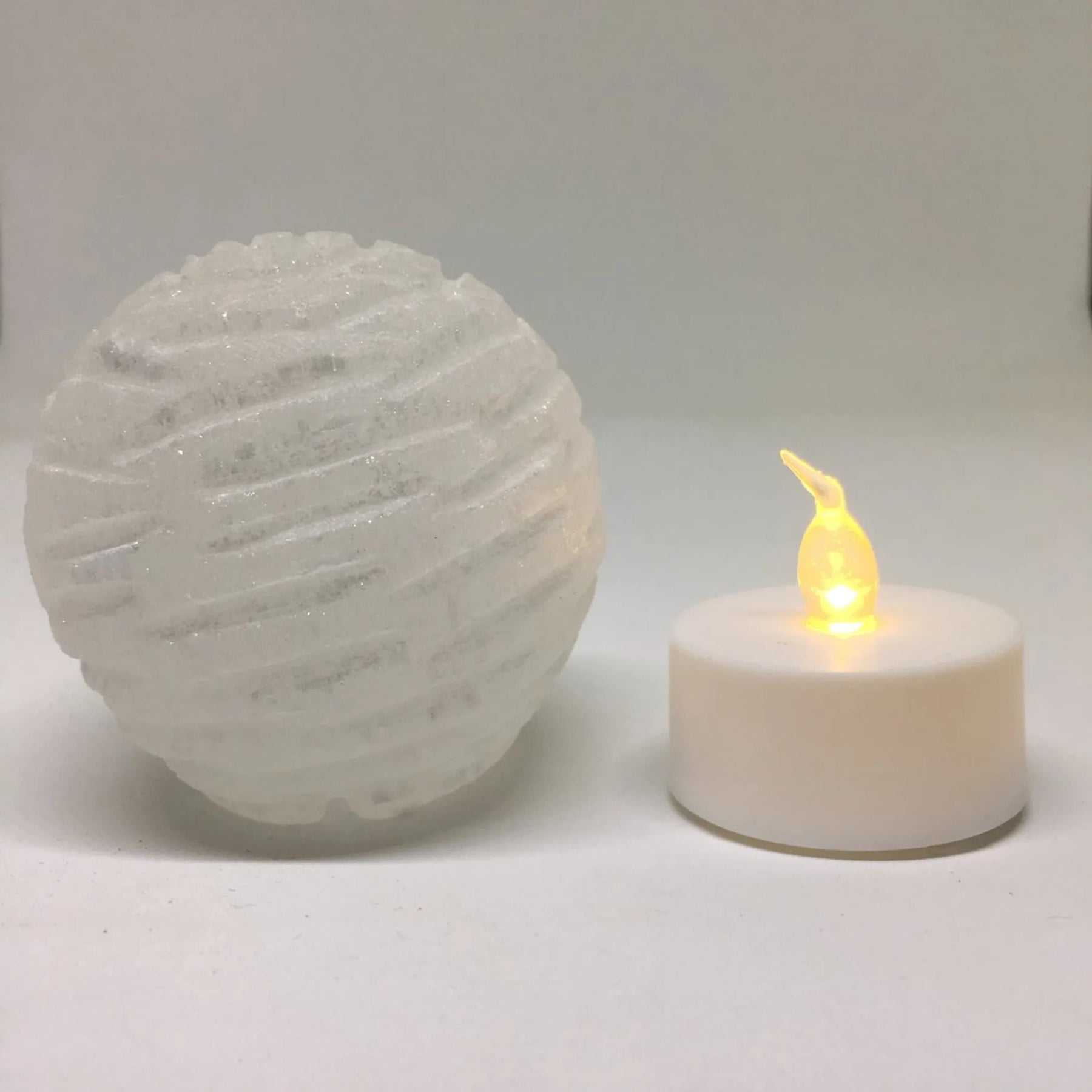 Relaxing Selenite Bubble Lamp. LED on/off Tealight included 100 hours battery operated CR2032 warm yellow flame. Size: 2.5" diameter.