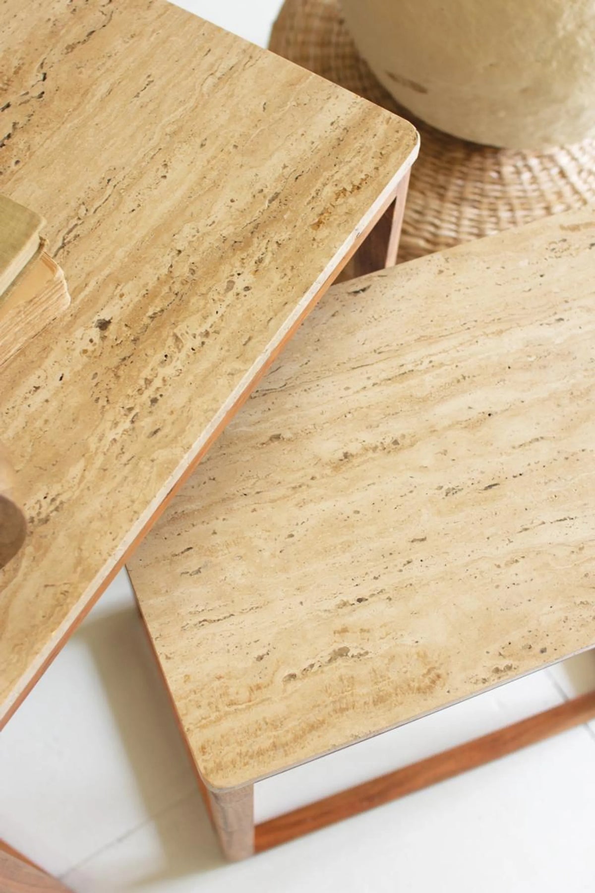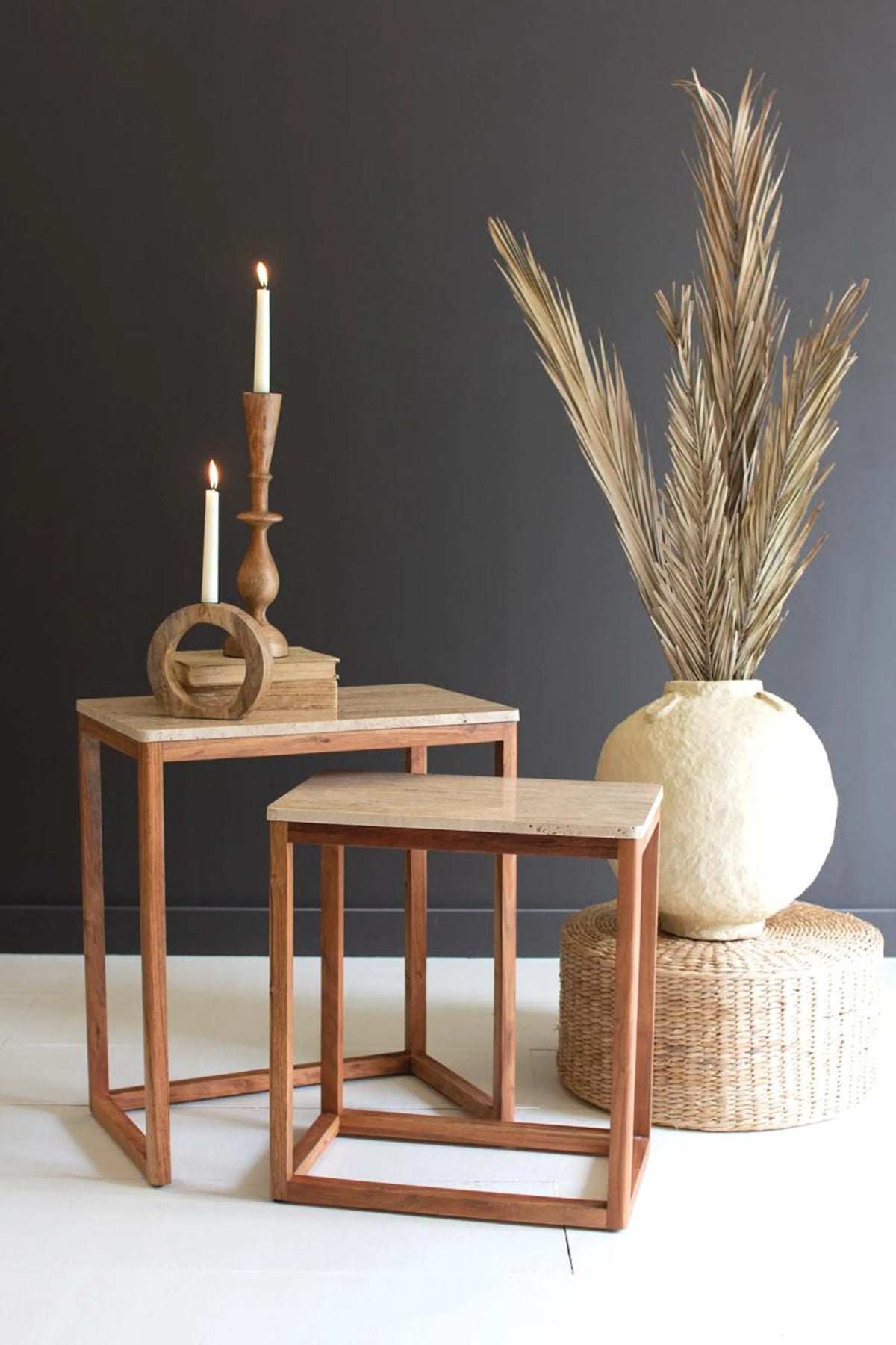SET OF 2 NESTING TRAVERTINE SIDE TABLES W ACACIA WOOD BASES
