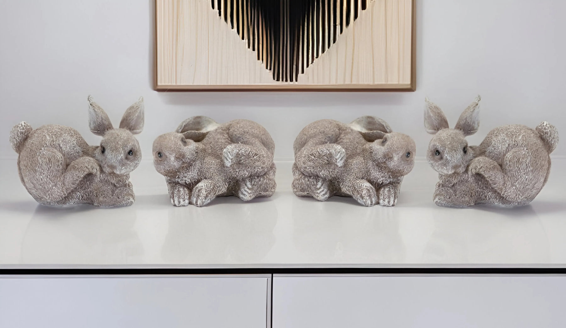 These rabbit figurines are versatile accents that can enhance seasonal displays, spring and Easter décor, or everyday interior styling. Their neutral gray and brown tones make them easy to pair with other decorative elements such as vases, candles, or greenery, creating a harmonious and inviting vignette.