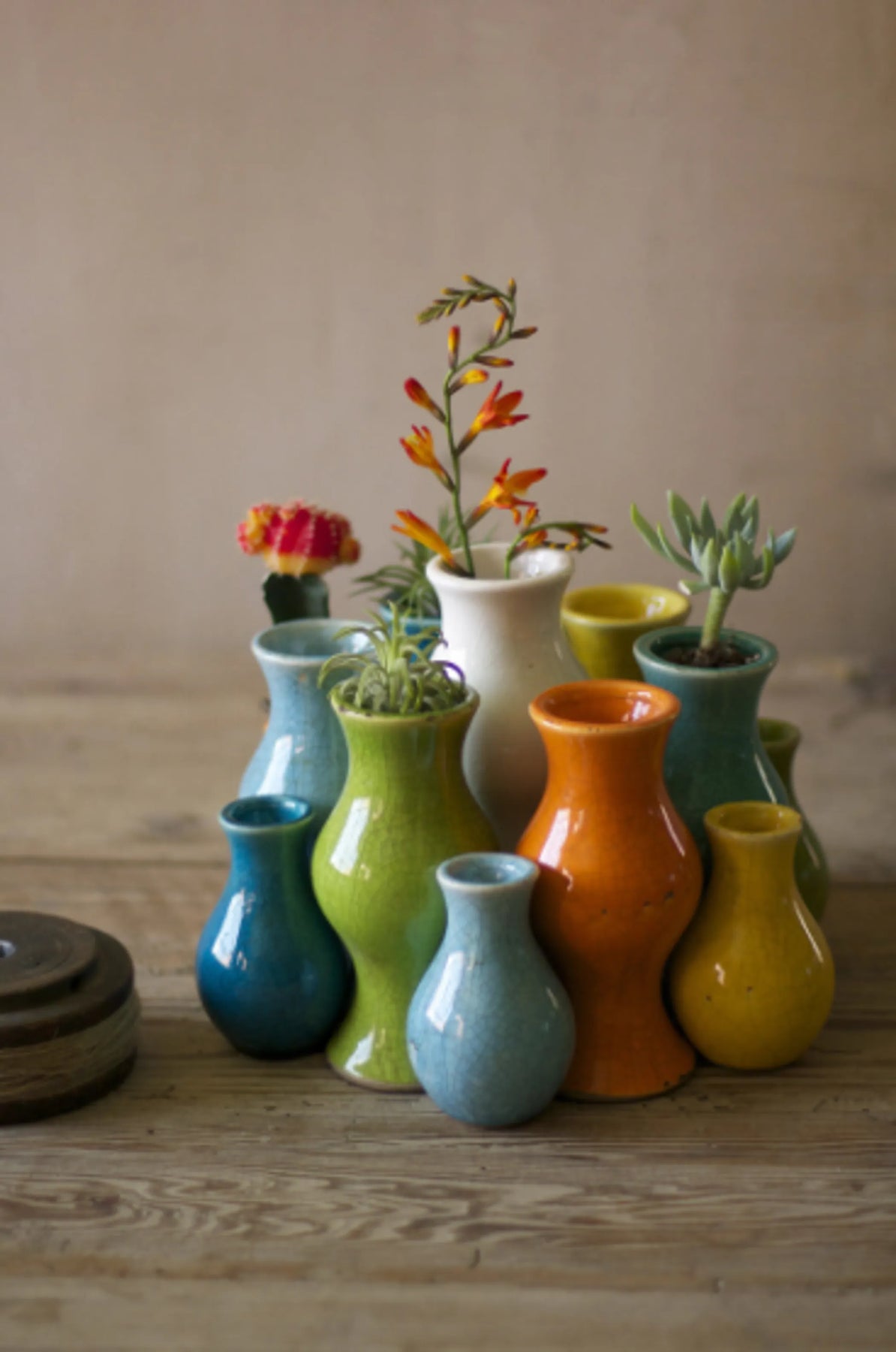 This set of thirteen ceramic bud vases is a wonderful collection for holding your succulents or any other small plant. Each set includes a variety of cheery, yet delicate colors. They look fabulous grouped together but are also a great way to spread some color throughout your home.
