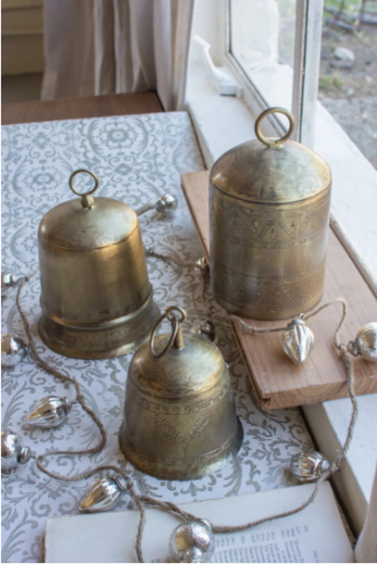 Ring in the holiday season with this set of three Christmas bells. Made in India, this set has a brass finish for a truly antique look. They will look wonderful on your coffee table or bookshelf for the holidays or any day! Etched metal with