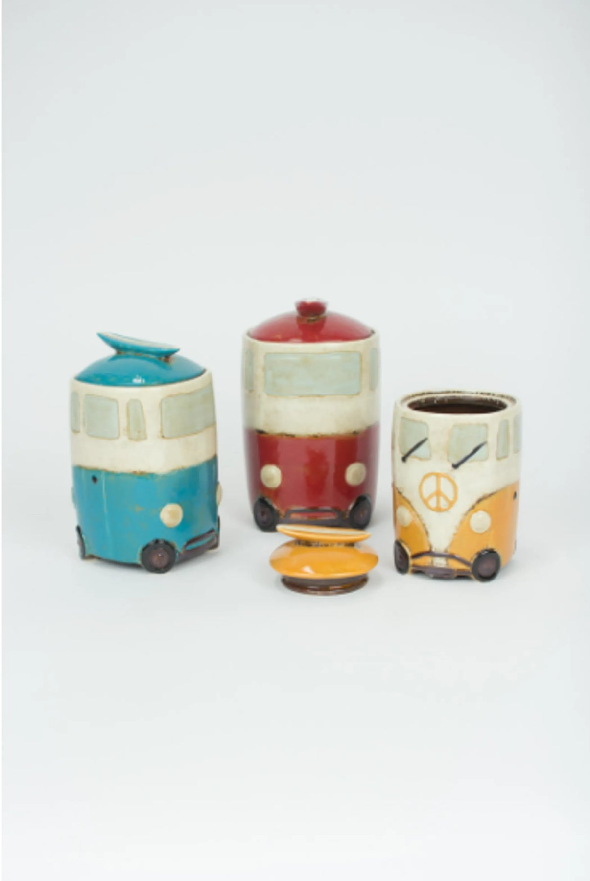 Set Of Three Ceramic Van Canisters With Surfboard Handles