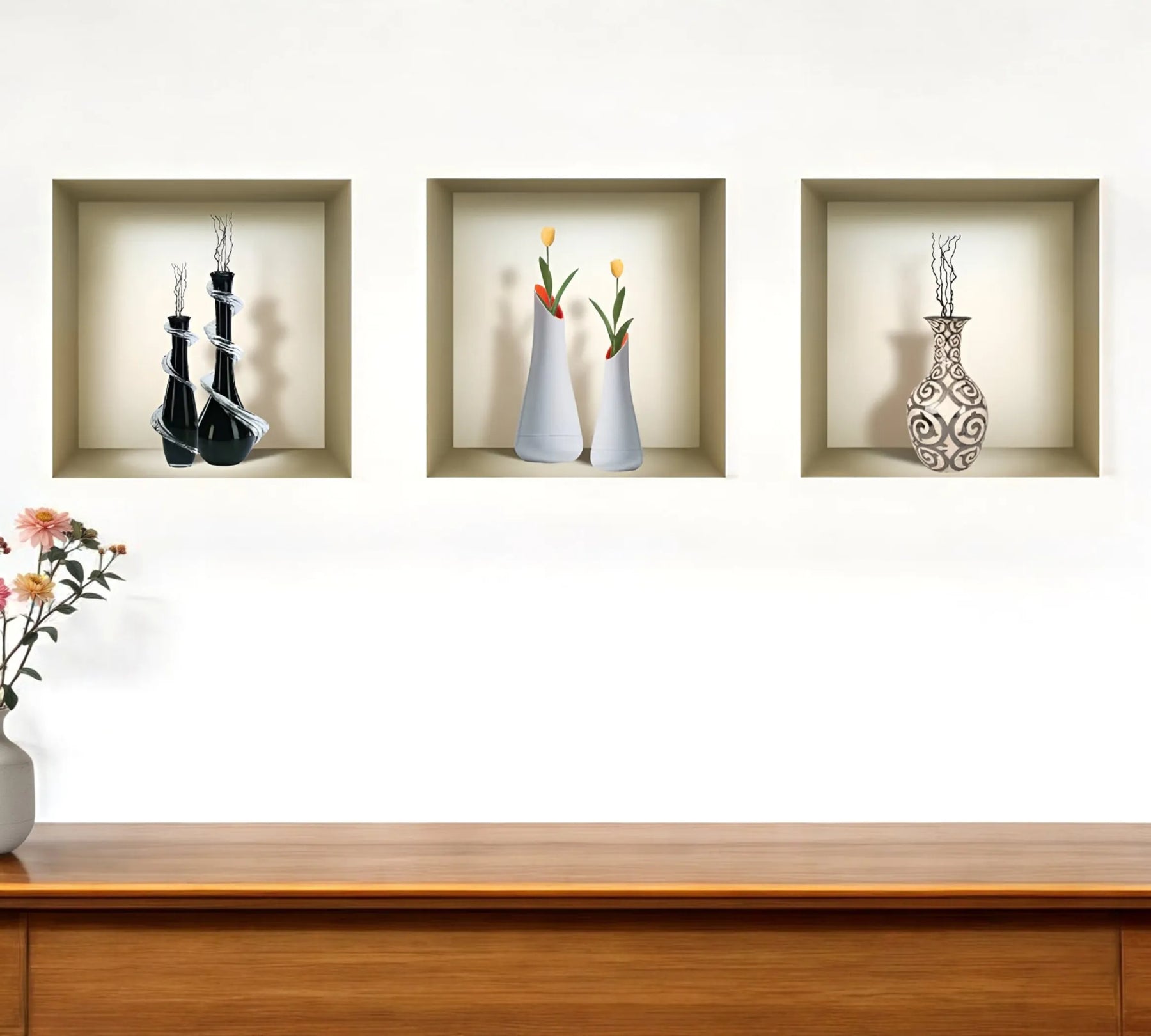 The realistic 3D design features shadowing and depth perception to create a lifelike niche effect. Display them individually for subtle impact or as a trio for a dramatic wall presentation. These decals also provide the opportunity to showcase decorative items within the visual niches, enhancing the illusion and adding personality to your walls.