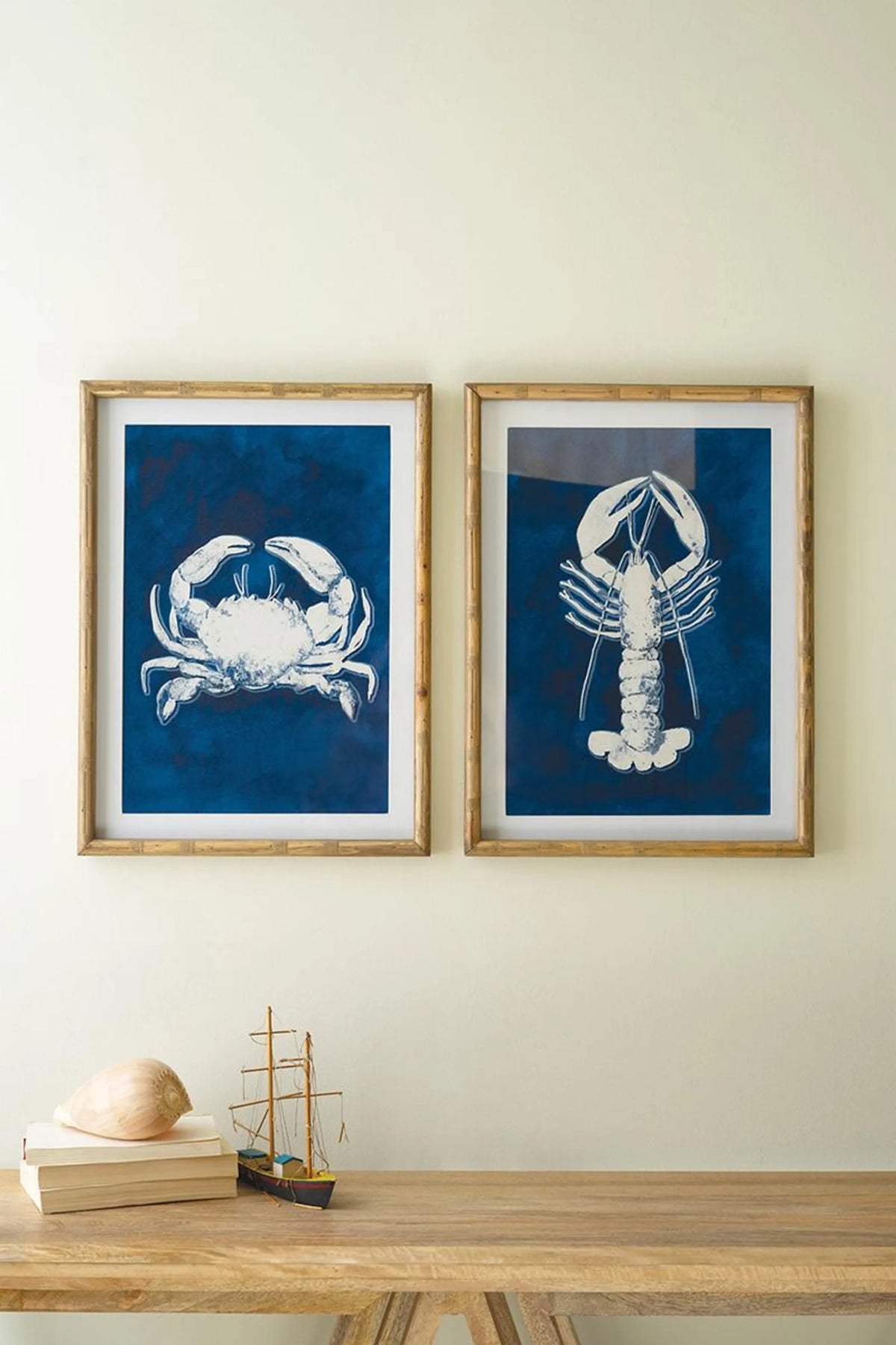Get your claws on this set of two crustacean prints. A deep blue background and white crab and lobster prints with cane frames make this set perfect for beachside housing or a sea-themed kitchen or bath. Split the set or group them with other ocean elements.