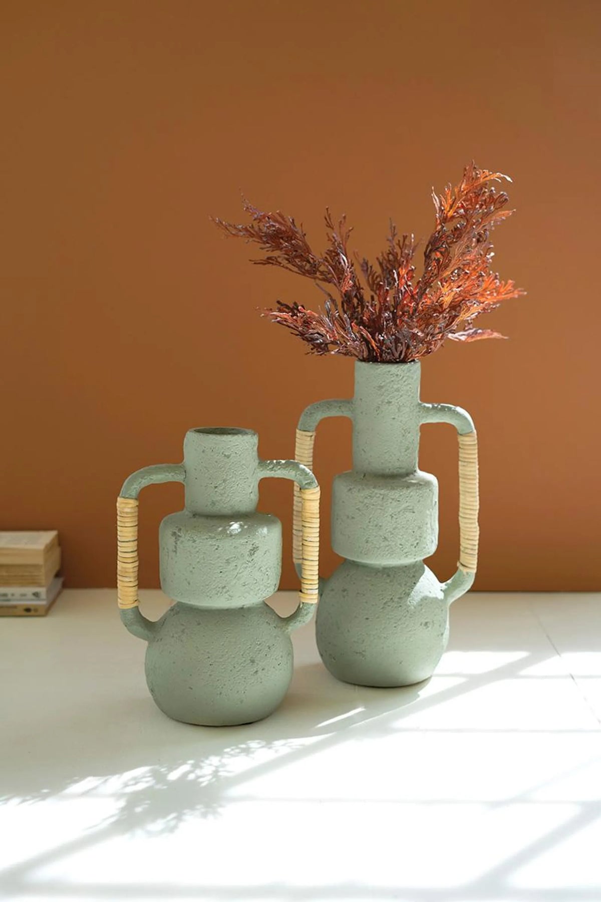 Grab a set of these green paper mache vases with cane handle details. This set of two handled vases makes a great pairing for a dining table or separate them on either side of a shelf or mantle. Made in India