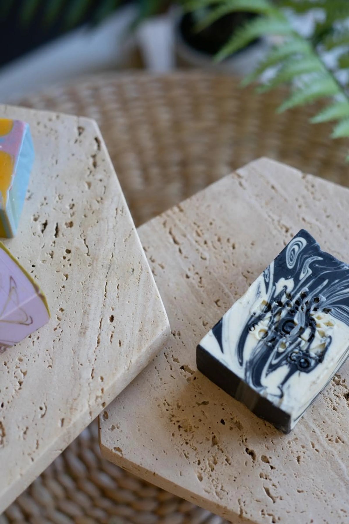 These travertine-topped tables really stack up. Elevate bathroom storage, a candle collection, or other display items with this set of two tables with mango wood bases made in India. Two pedestal heights (8.8" and 6") mean you can use them together as tiered tables, separately, or stacked!