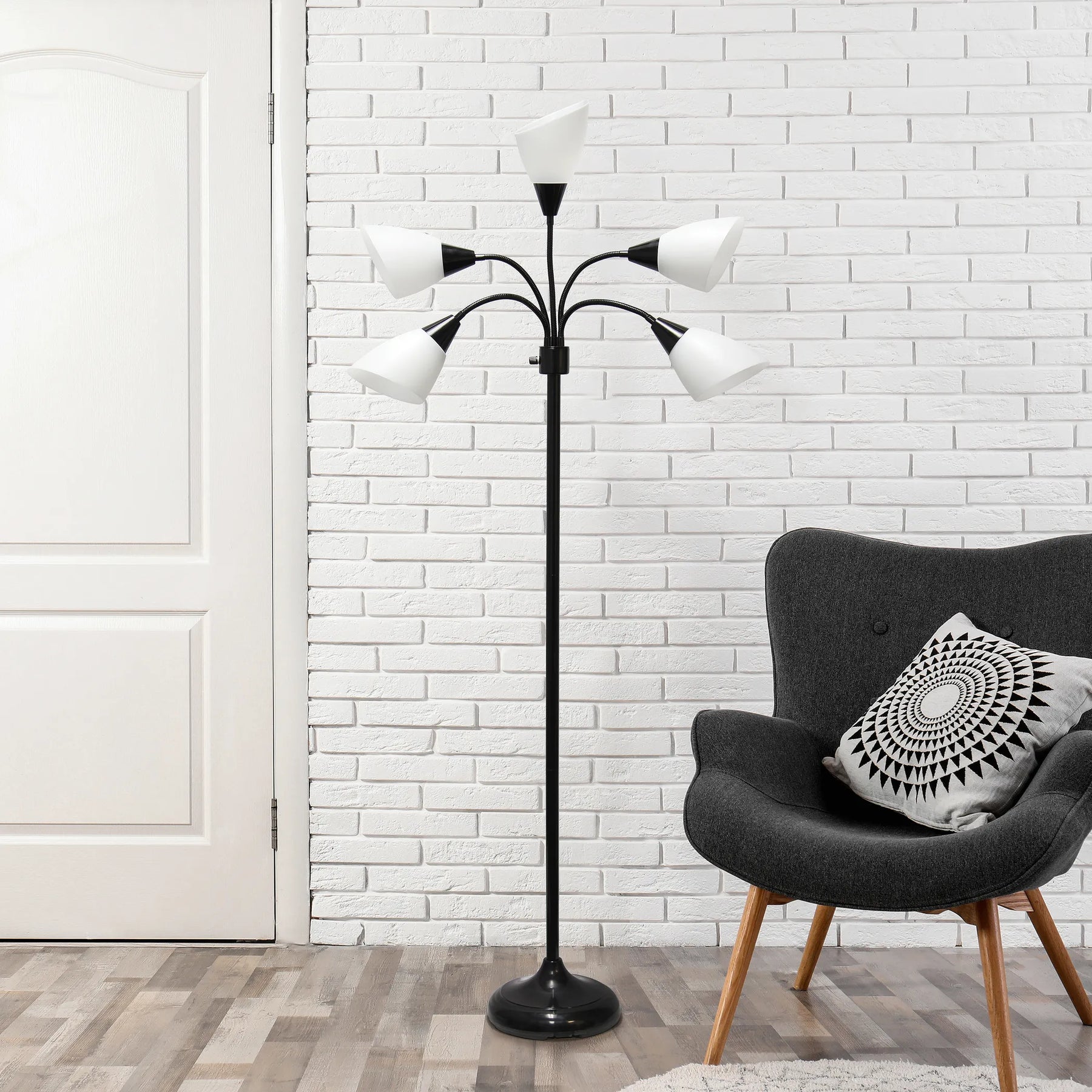 Simple Designs 5 Light Adjustable Gooseneck Black Floor Lamp with White Shades