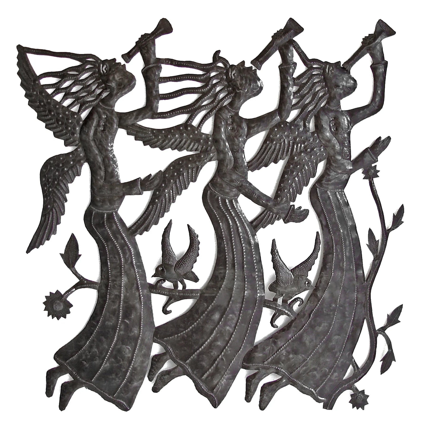 Perfect for home or garden, each Three Angels is approximately 30" x 30" x 0.5" and hand-chiseled out of recycled steel oil drums by Haitian artisans using techniques first developed by Georges Liautaud in the late 1950s when he chalked out his first design on a flattened steel oil drum and then cut it out by hand with a mallet and chisel. As each piece is handmade, their final dimensions and finish may vary slightly.