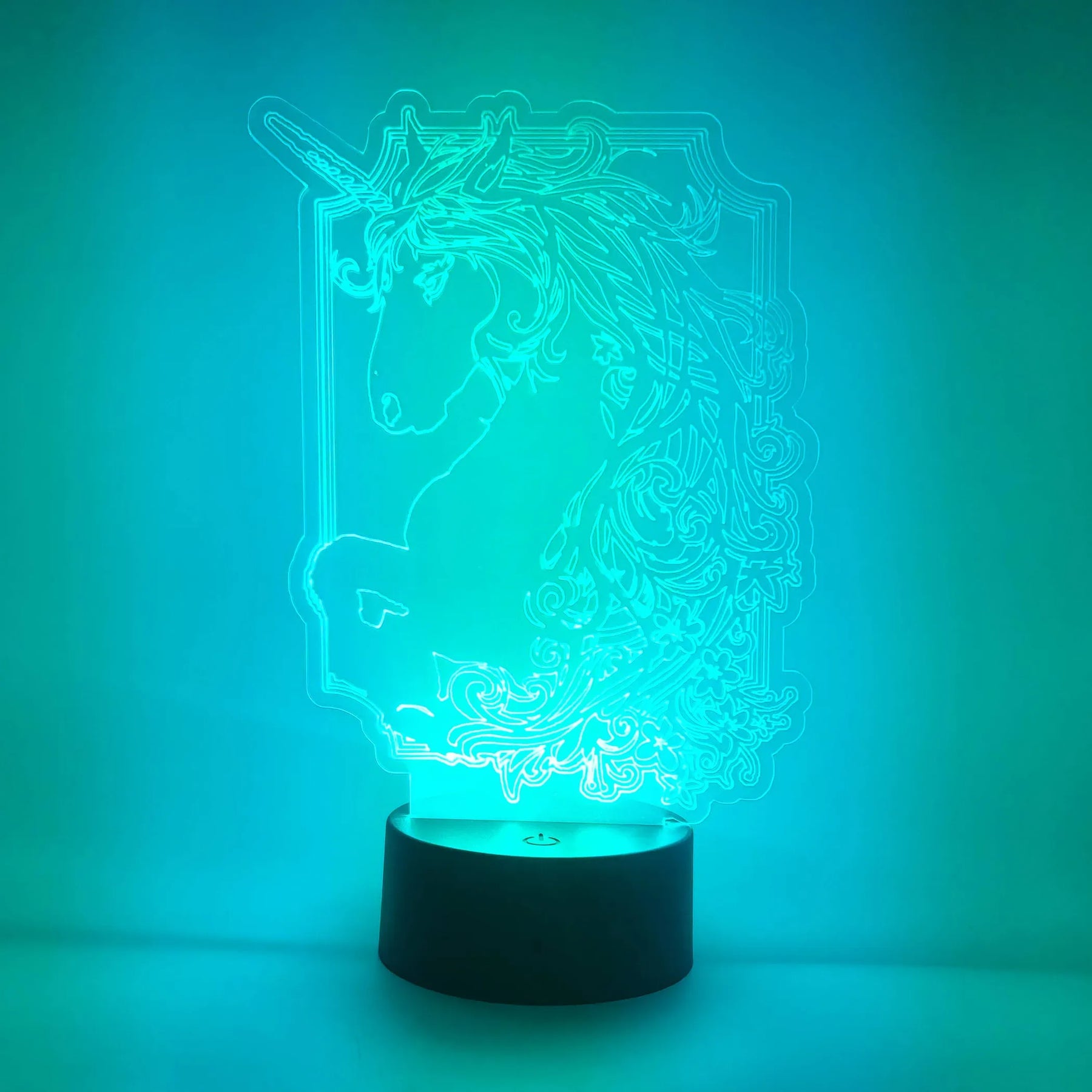 Unicorn nightlight lamp providing color-changing ambient light. Dual powered and including a remote control, this lamp offers 16 RGB colors and four rotating light modes. Fun room decor and a useful nightlight or desk lamp, all in one.