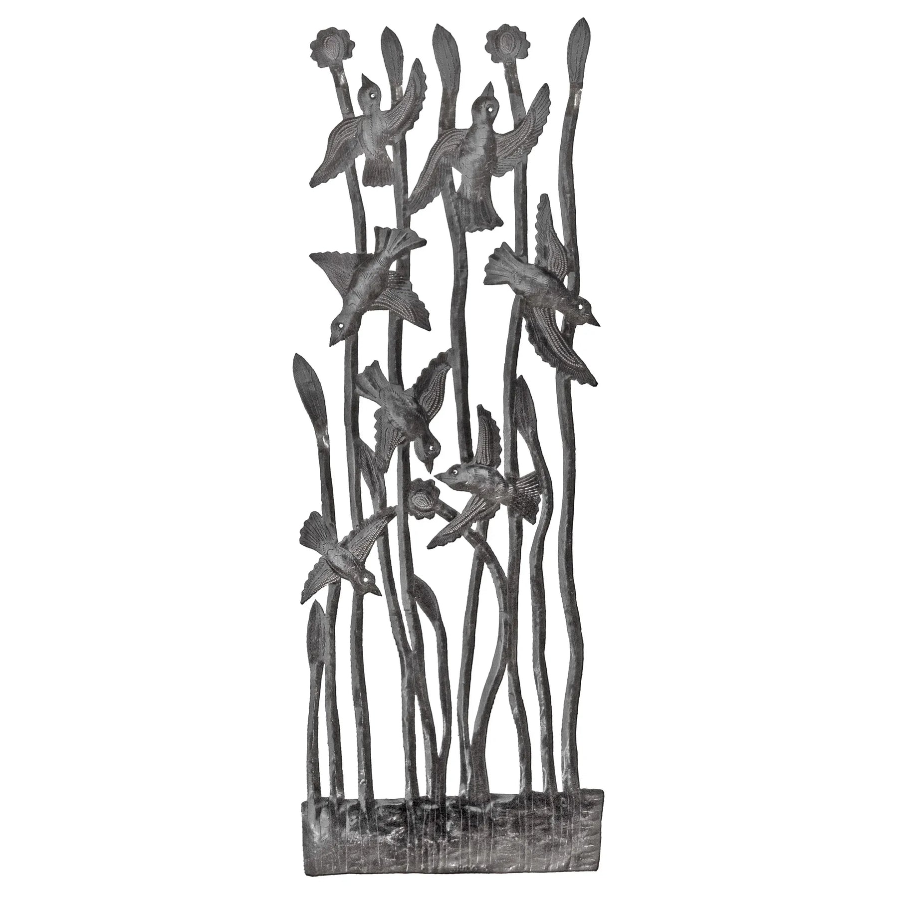Perfect for home or garden, each Vertical Birds in Reeds is approximately 12" x 34" x 0.5" and hand-chiseled out of recycled steel oil drums by Haitian artisans using techniques first developed by Georges Liautaud in the late 1950s when he chalked out his first design on a flattened steel oil drum and then cut it out by hand with a mallet and chisel. As each piece is handmade, their final dimensions and finish may vary slightly.