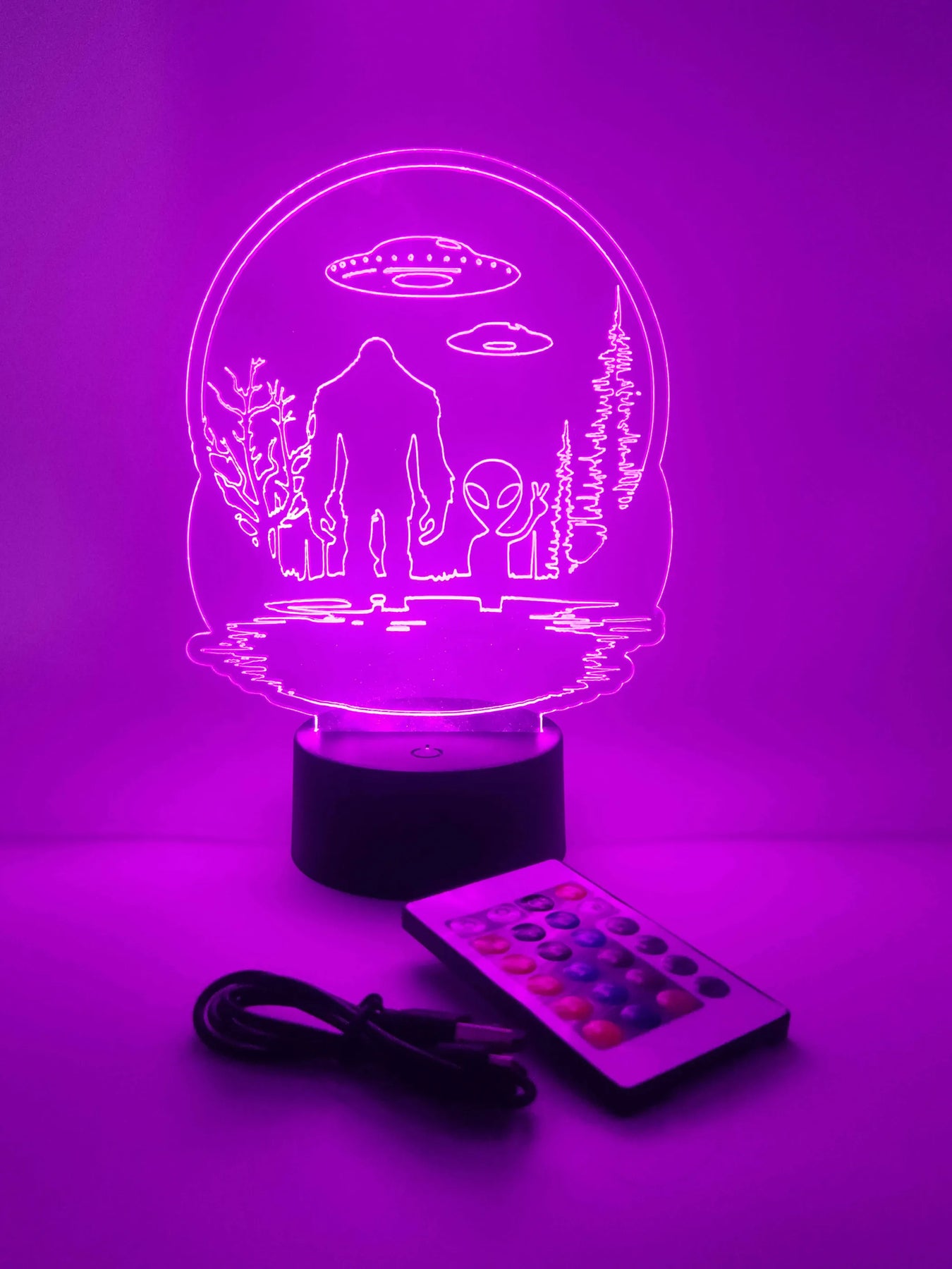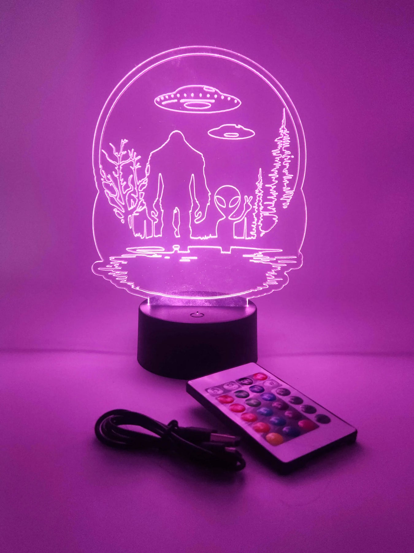 Cryptozoology accent lamp providing color-changing ambient light. Dual powered and including a remote control, this lamp offers 16 RGB colors and four rotating light modes. Fun room decor and a useful nightlight or desk lamp, all in one.
