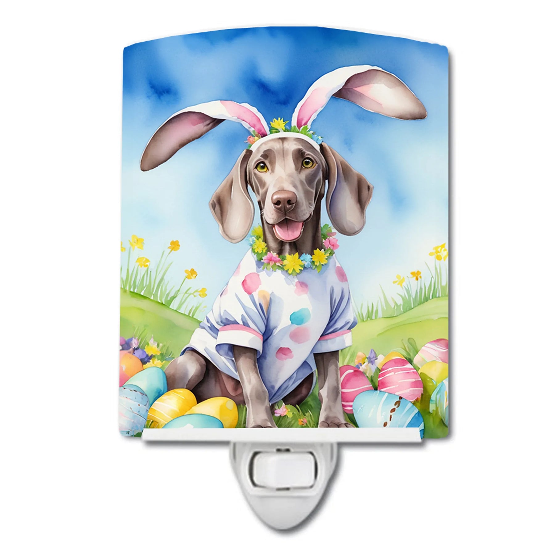 Ceramic Night Light featuring breed specific Weimaraner artwork. Celebrate Easter with this Easter Night Light. Introduce a splash of artistic flair and subtle illumination to your space with the Decorative Ceramic Night Light from Caroline's Treasures. Perfect for any room, this night light seamlessly blends functionality with an aesthetic appeal, offering a stylish solution to brighten up dark corners of your home or office. Boasting a six-inch high by four-inch wide ceramic tile at the front, it showcases vivid, full-color artwork from distinguished artists, transforming a simple utility into a vibrant art piece. The artwork is securely encased in a robust metal holder, ensuring durability and longevity. Two screws are provided to firmly affix the tile into the holder. The holder extends three inches deep, housing an included bulb that emits a soft, welcoming glow. This product meets all safety standards, as evidenced by its UL approval. Proudly made in the United States from imported components, this Decorative Ceramic Night Light is not just a functional device; it's a statement piece that enhances the ambiance of your surroundings.