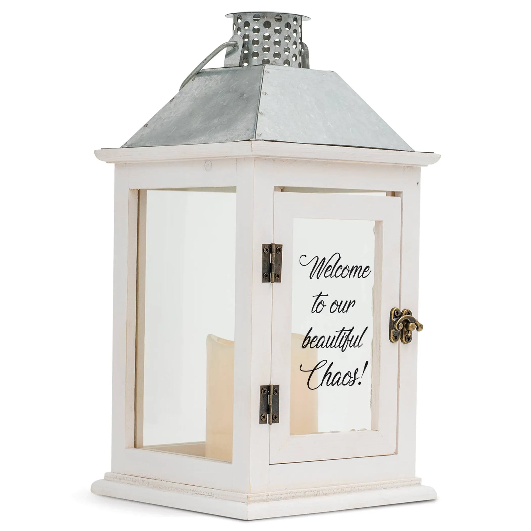 "Welcome to our beautiful Chaos!." Elegant wood lantern is white with rustic distressed edges.