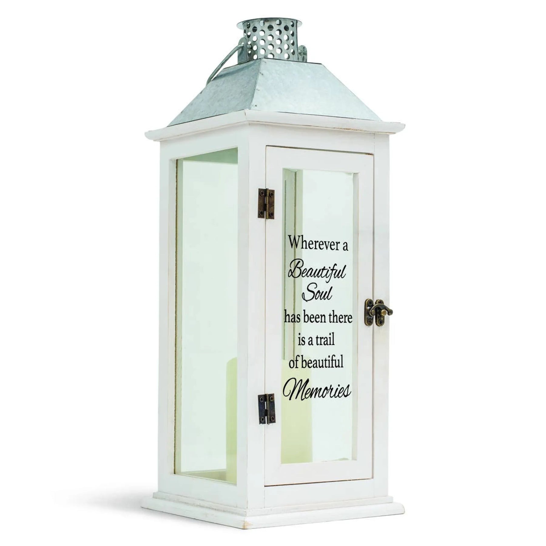 "Wherever a beautiful soul has been there is a trail of beautiful memories." Words of comfort D?corate this tall, elegant white wood lantern.
